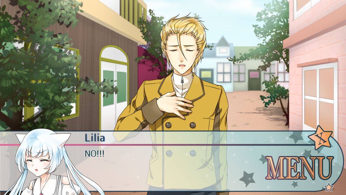 She panics, jumps out through her room's window, and runs towards the town. And the first person she bumps into is the reliable city guard, Ronan.