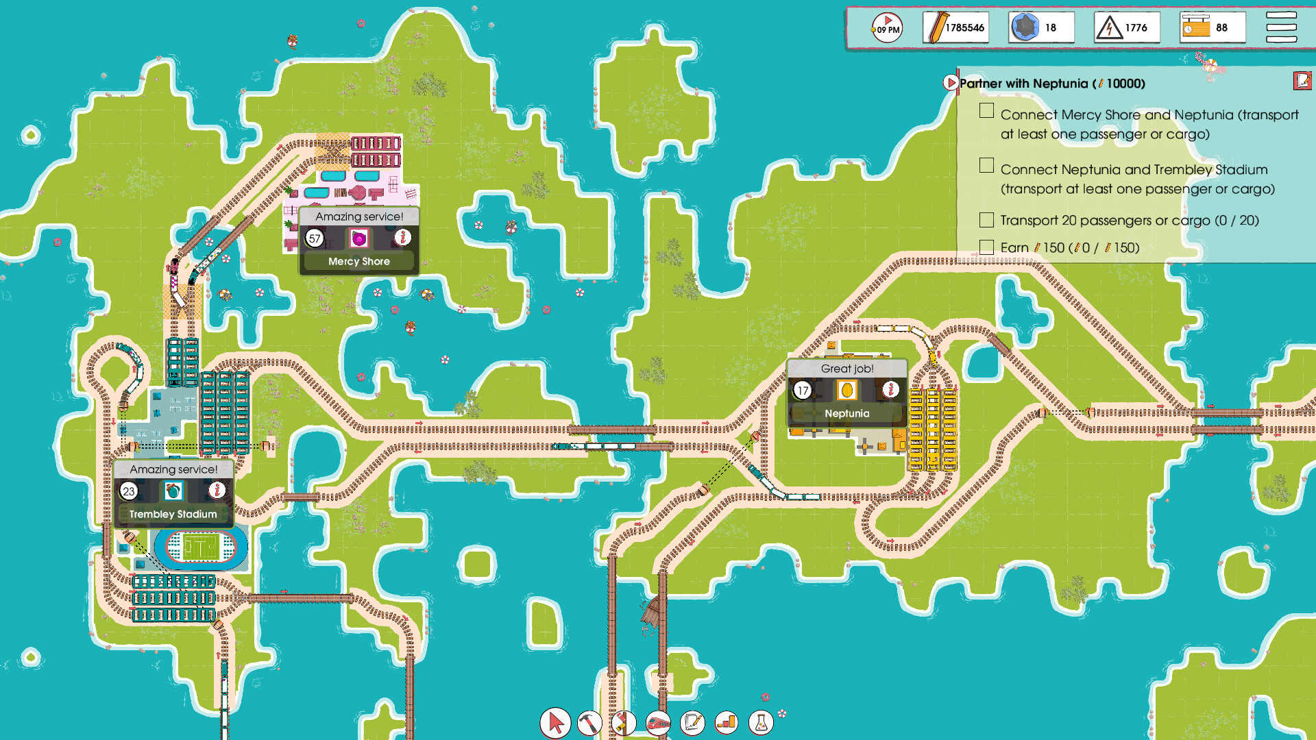 Your goal is to set up an efficient rail network that keeps your passengers happy and on-time