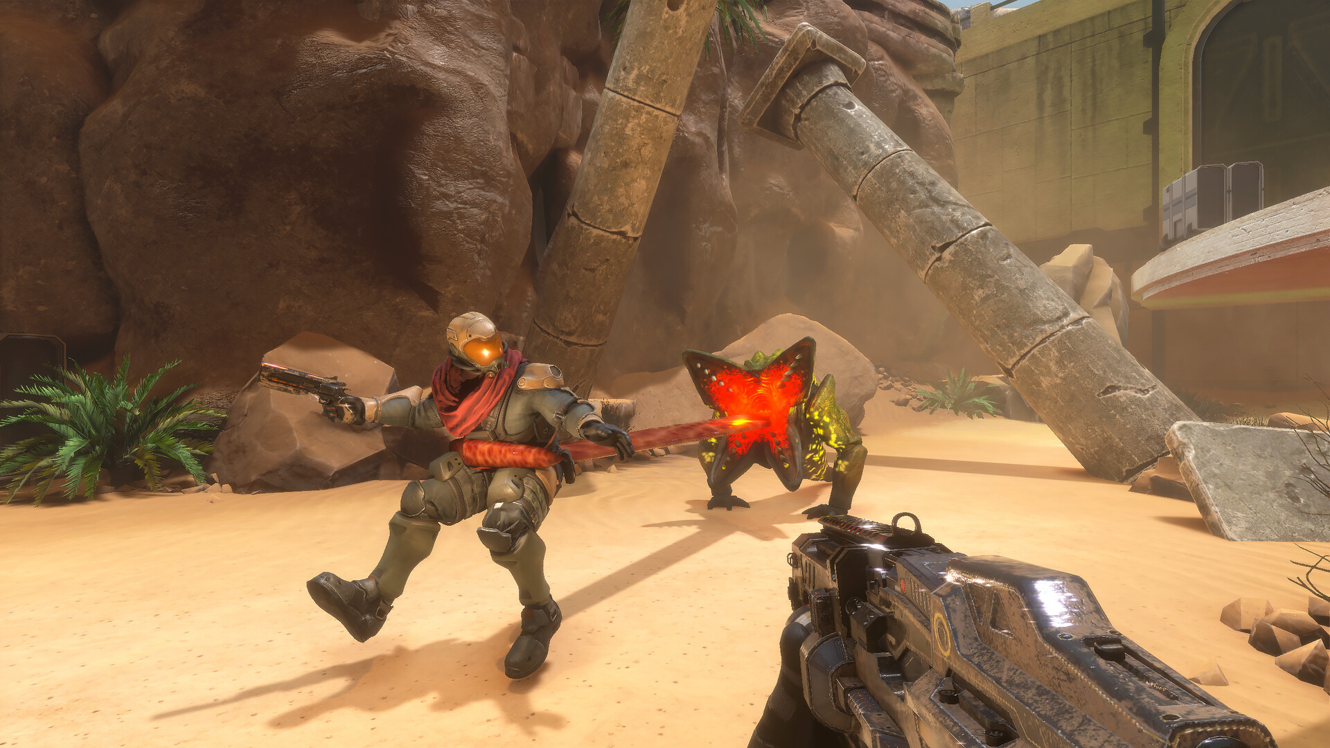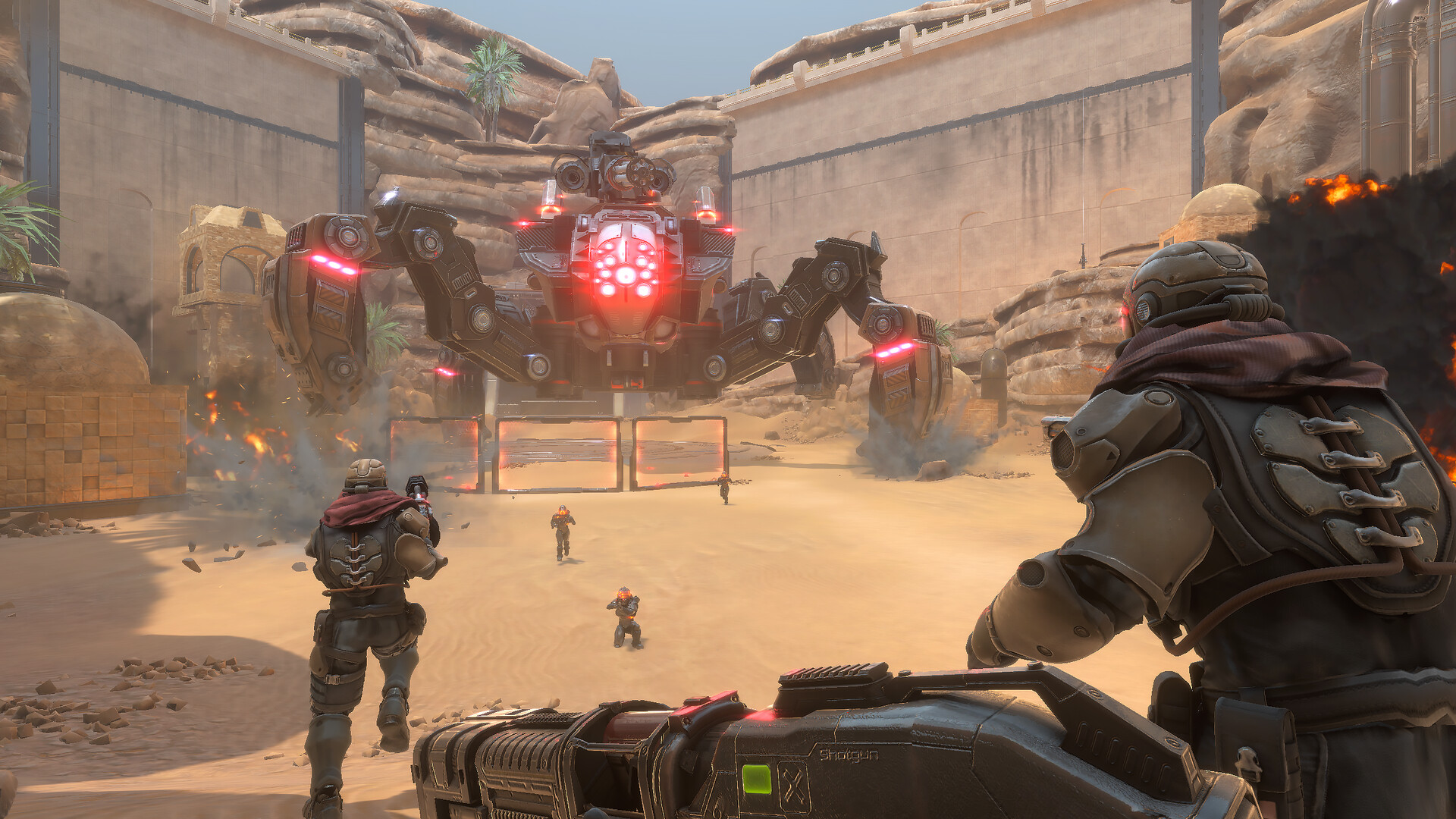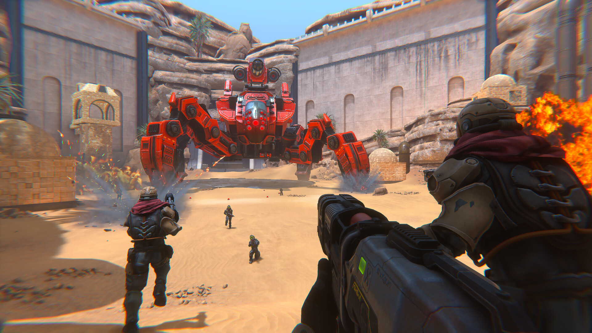You are the best special forces unit of the Galactic Union. Your task is to land on the desert planet of the Long-eared and protect them from the followers of the Cult of the Iron God. Destroy all the enemies on your way. The main task is to find and destroy the huge Titan combat robots. And don't forget to keep an eye on the sand, there may be creatures scarier than cyborgs hiding under it