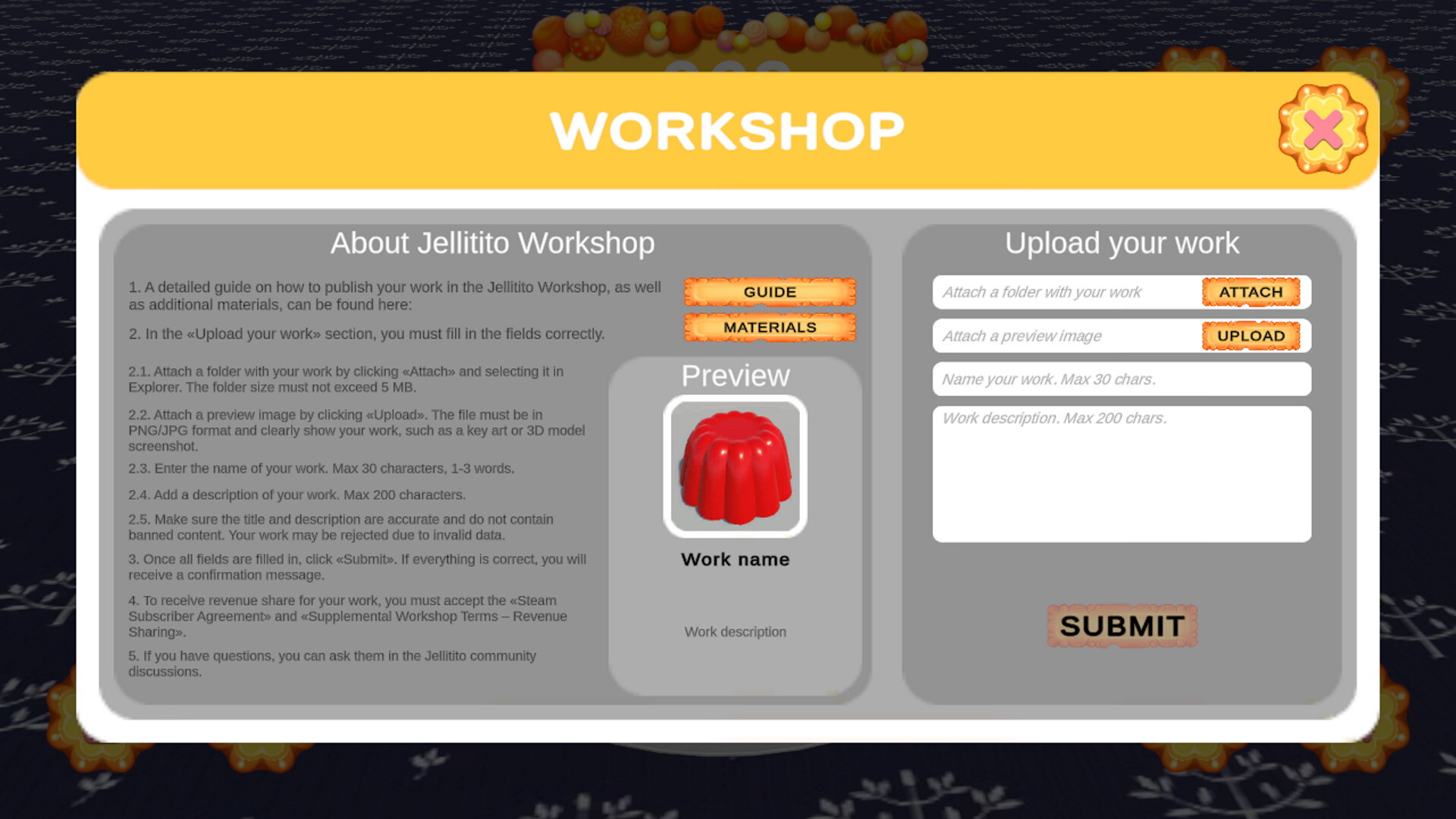 Jellitito is a simple anti-stress clicker. You don't need to do anything but click on the jelly, enjoying the process. During the game, you have an opportunity to get skins for the jelly or table, which will be notified by the Steam notification service. By clicking on the “inventory” button, you can replace the standard colors with those skins that you like more from the available ones. And if you want something new, you can always exchange skins with friends or use the opportunity provided by Steam!