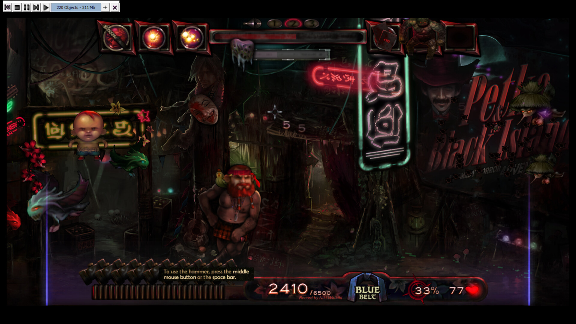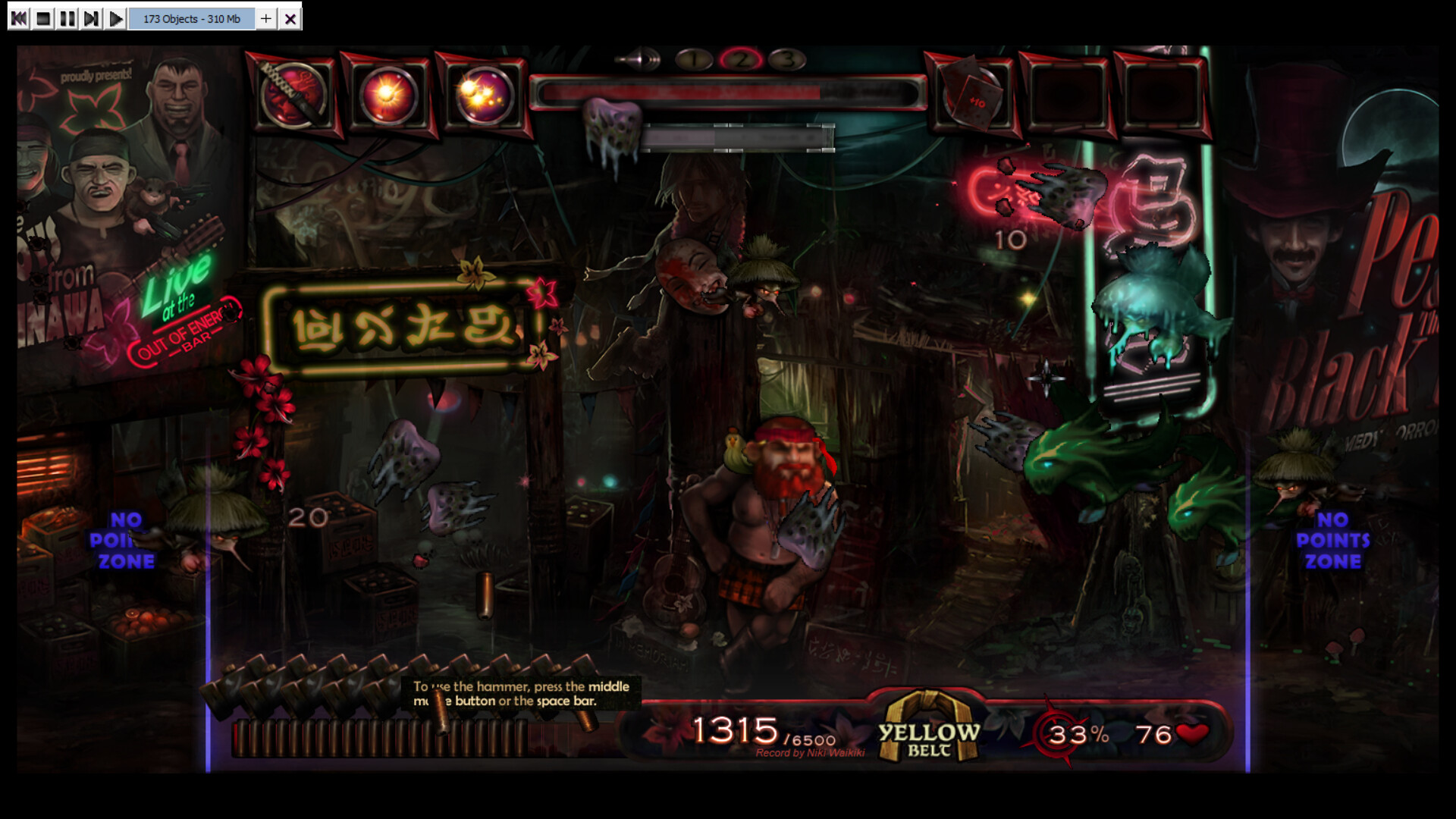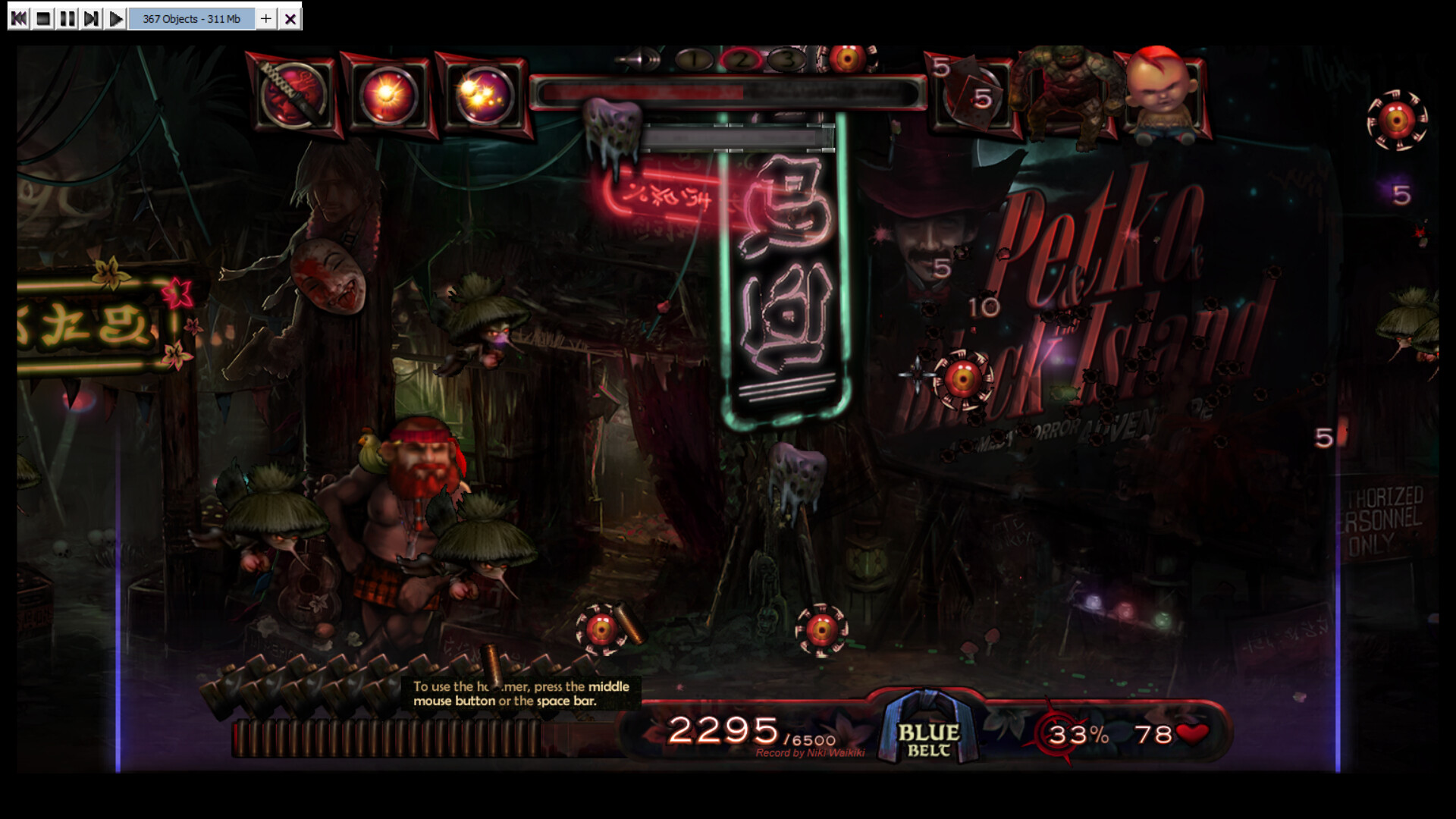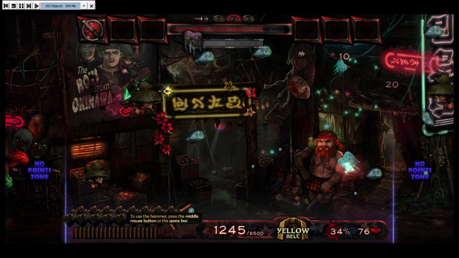 Test your reflexes and precision in this quirky hand-painted 2D shoot 'em up. The goal is to score points by shooting enemies and bonus objects within a time frame of action-packed 7 minutes plus bonus time. Climb up the high-score table and reach the rank of black belt (or maybe even one of the legendary red belts!). As the time counter progresses, your enemies are getting more aggressive and are furiously throwing dragon fire and zombie slime at you. Although you have unlimited ammo at your disposal, you are required to reload your gun regularly! Some enemies leave bonus objects in the arena after they vanish. These bonuses can be cached and stored in the inventory for strategic use or released immediately as they appear. The arsenal of bonuses include...