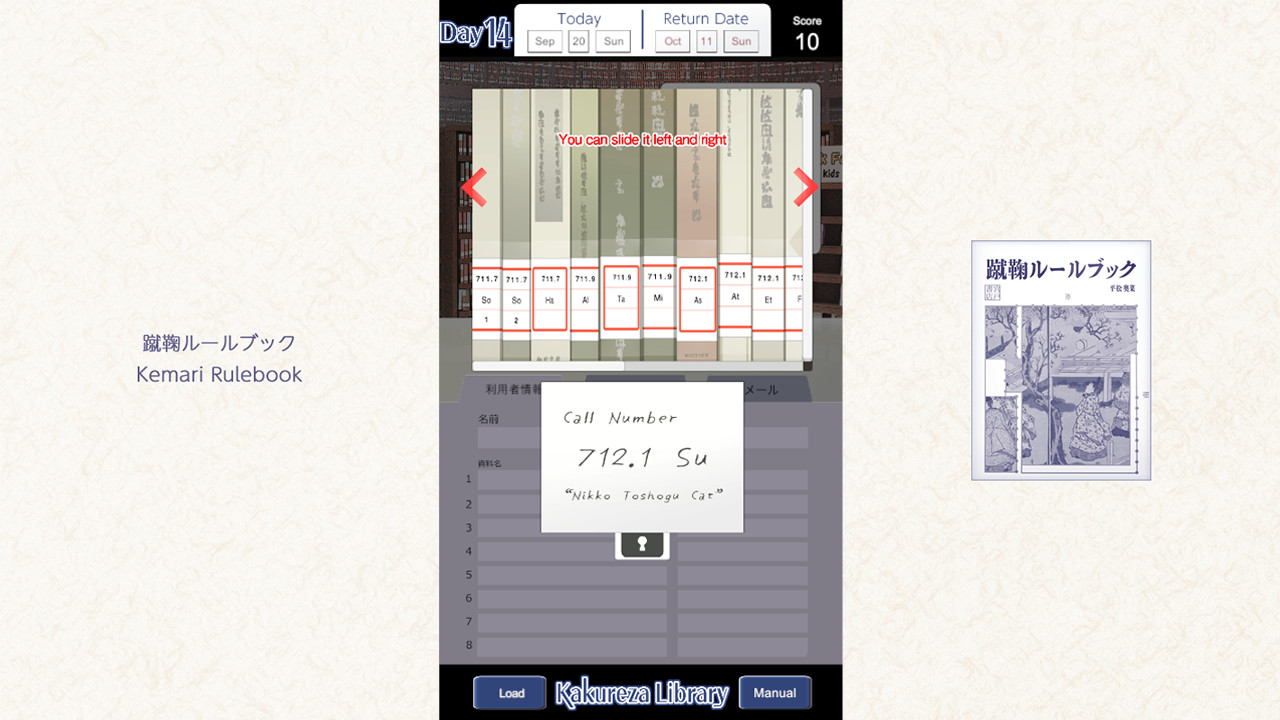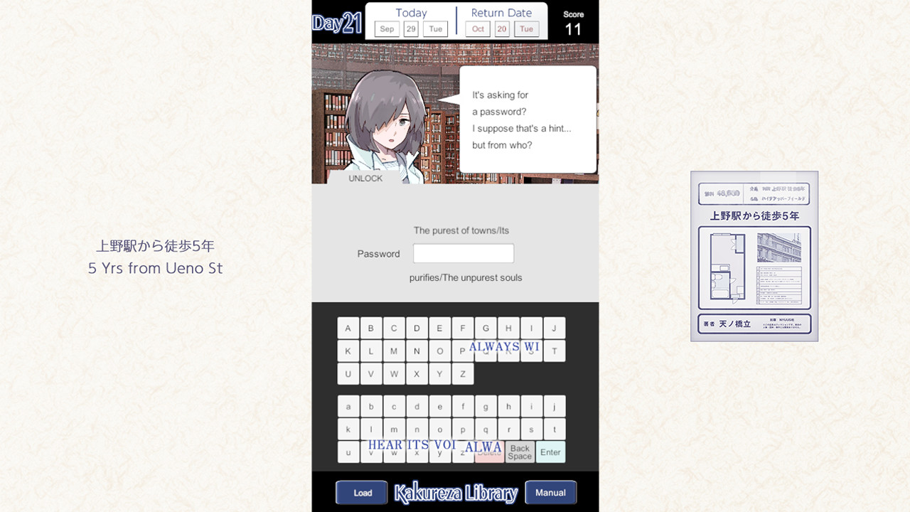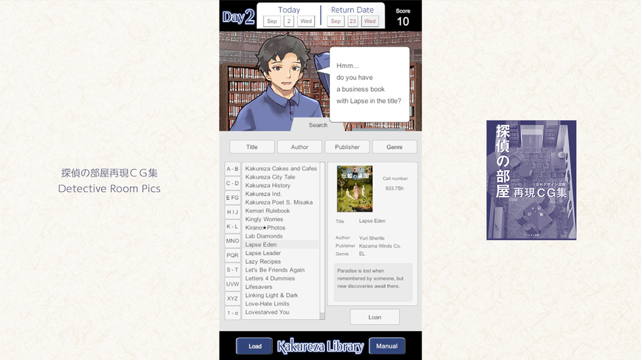 This is a librarian adventure game. As a new employee of the library, you will lend at the counter. The story branches by selecting the book that the user wants from all 260 books. Multi-ending with multiple bad ends.