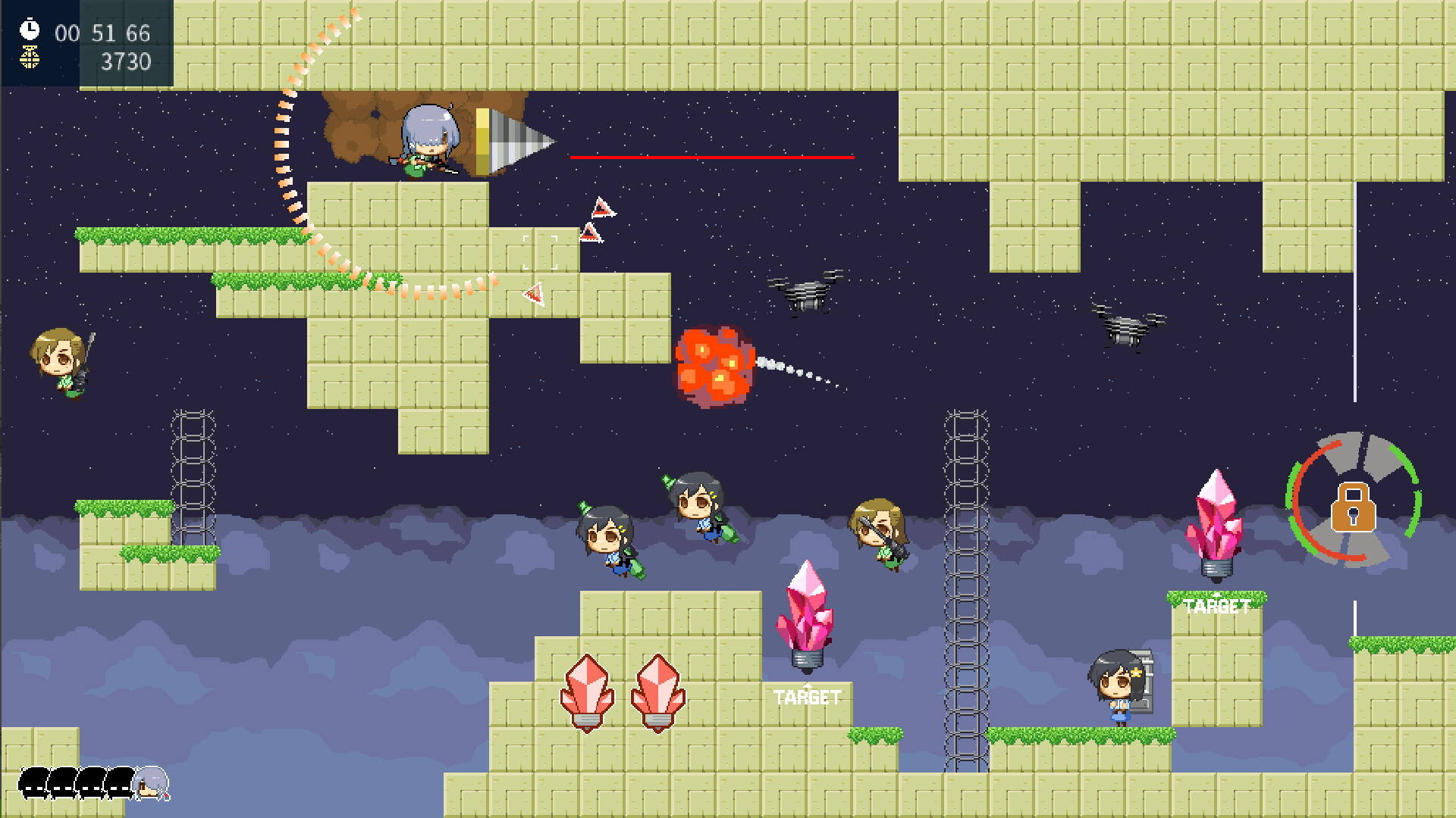Carve the path to victory with kamikaze attacks! Blow away enemies with outlandish weapons, then become your own projectile and take the rest out in a blaze of explosive glory! A self destructive shmup where you devastate everything in your wake. "Squadron, charge~!"