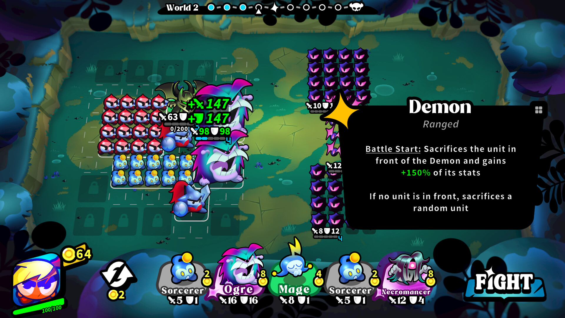 Knightica is a turn-based roguelike auto-battler where you lead an army of powerful units. Recruit, place and command your troops to free the Kingdoms. Discover amazing synergies, gather demonic souls, face dangerous monsters and lead your army to victory!