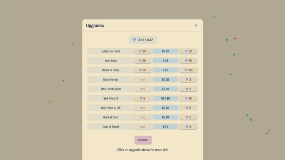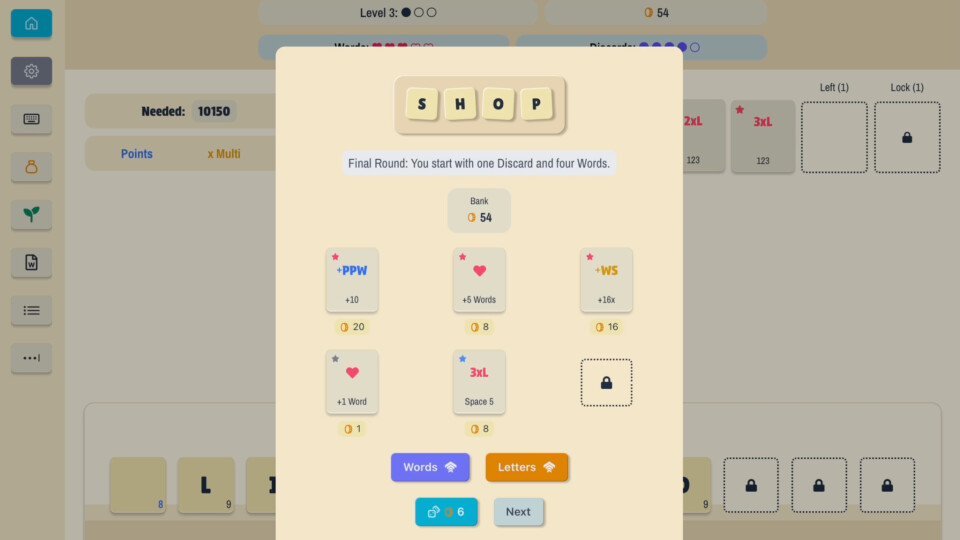 Start with a bag of letters to create an endless number of words of varying lengths! Collect items to create powerful synergies and new builds along the way. Upgrade words and letters to beat the boss at the end of each level - but be careful. Some of their abilities bite back hard! You're going to have to make the right upgrades to claim victory!