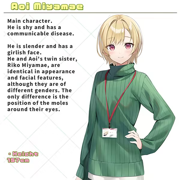 Aoi's twin sister, Riko Miyamae, has a different gender from Aoi, but they are identical in appearance and facial features.
