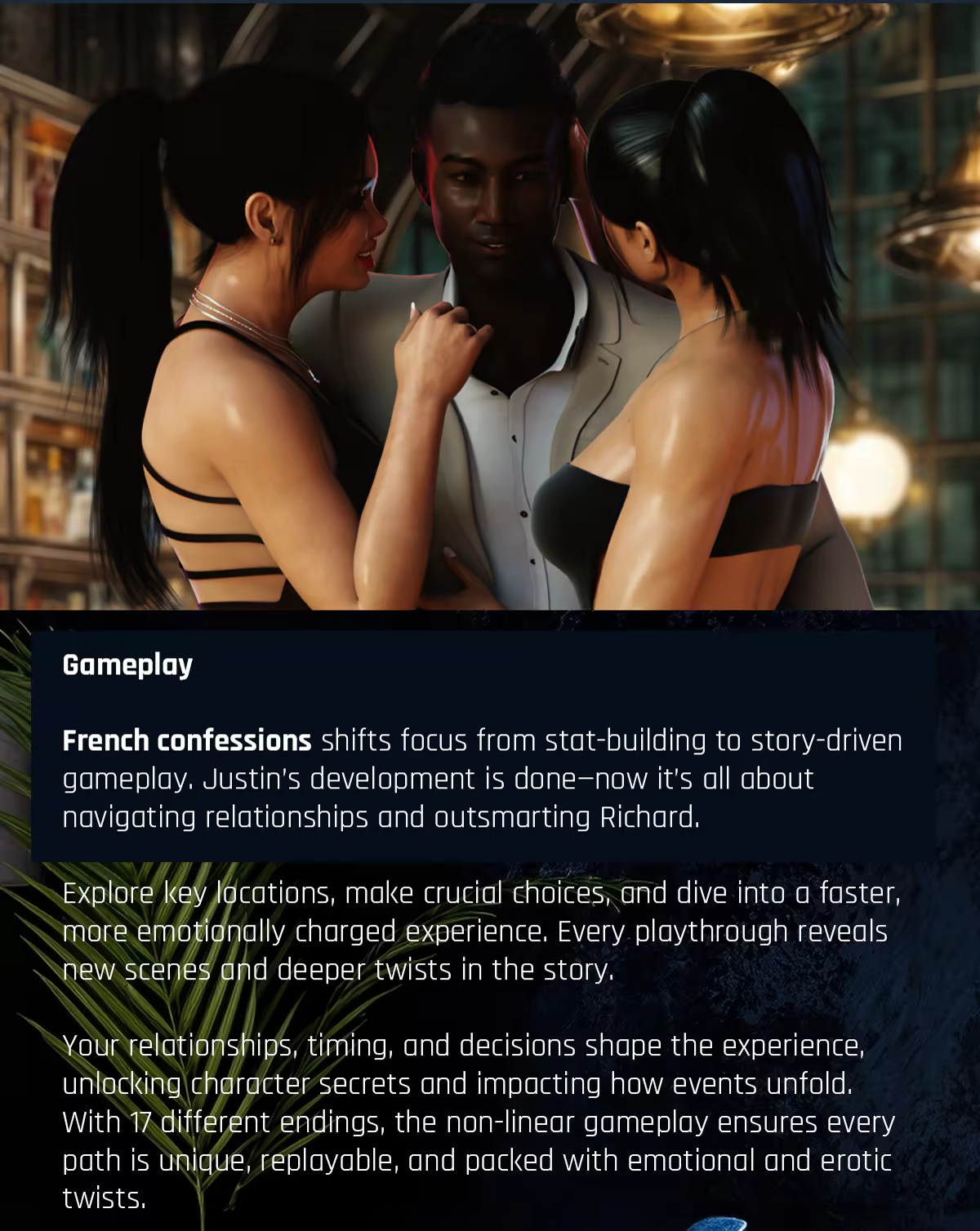 Join your wife Tracy and nanny Lisa on a trip to your cousin's lavish estate in France and embark on a sensual journey like no other. Encounter new acquaintances, challenge your loyalty, and explore the depths of temptation in all its hues.
