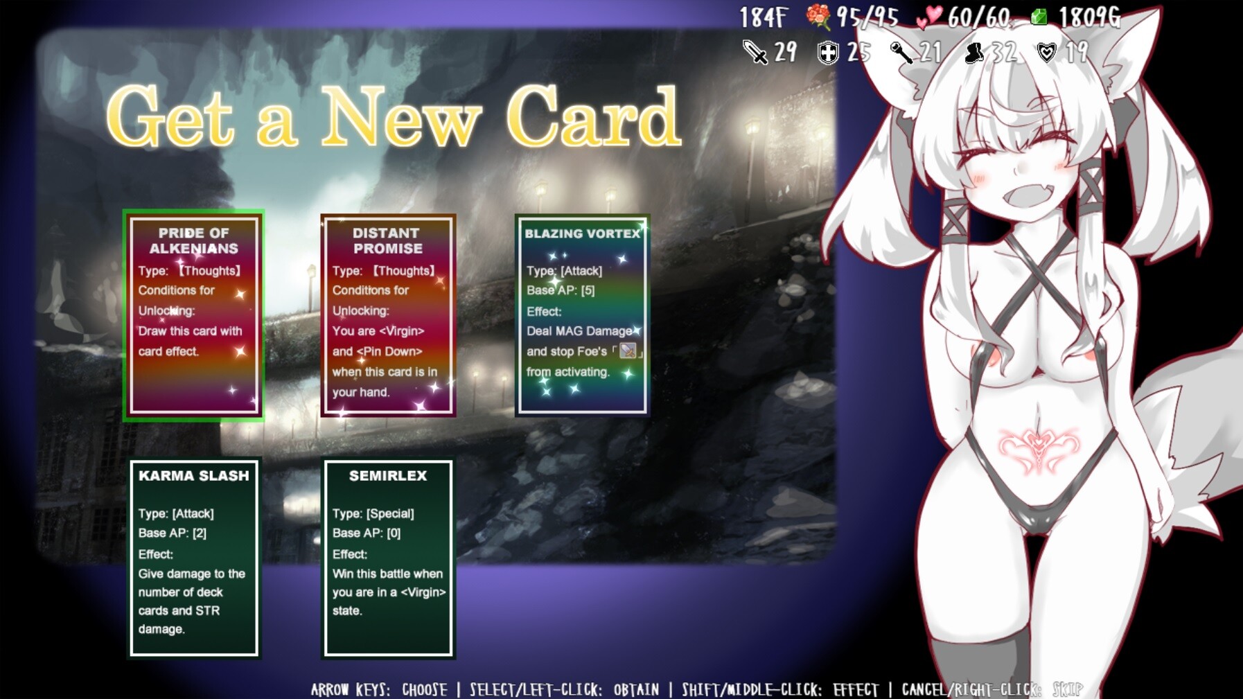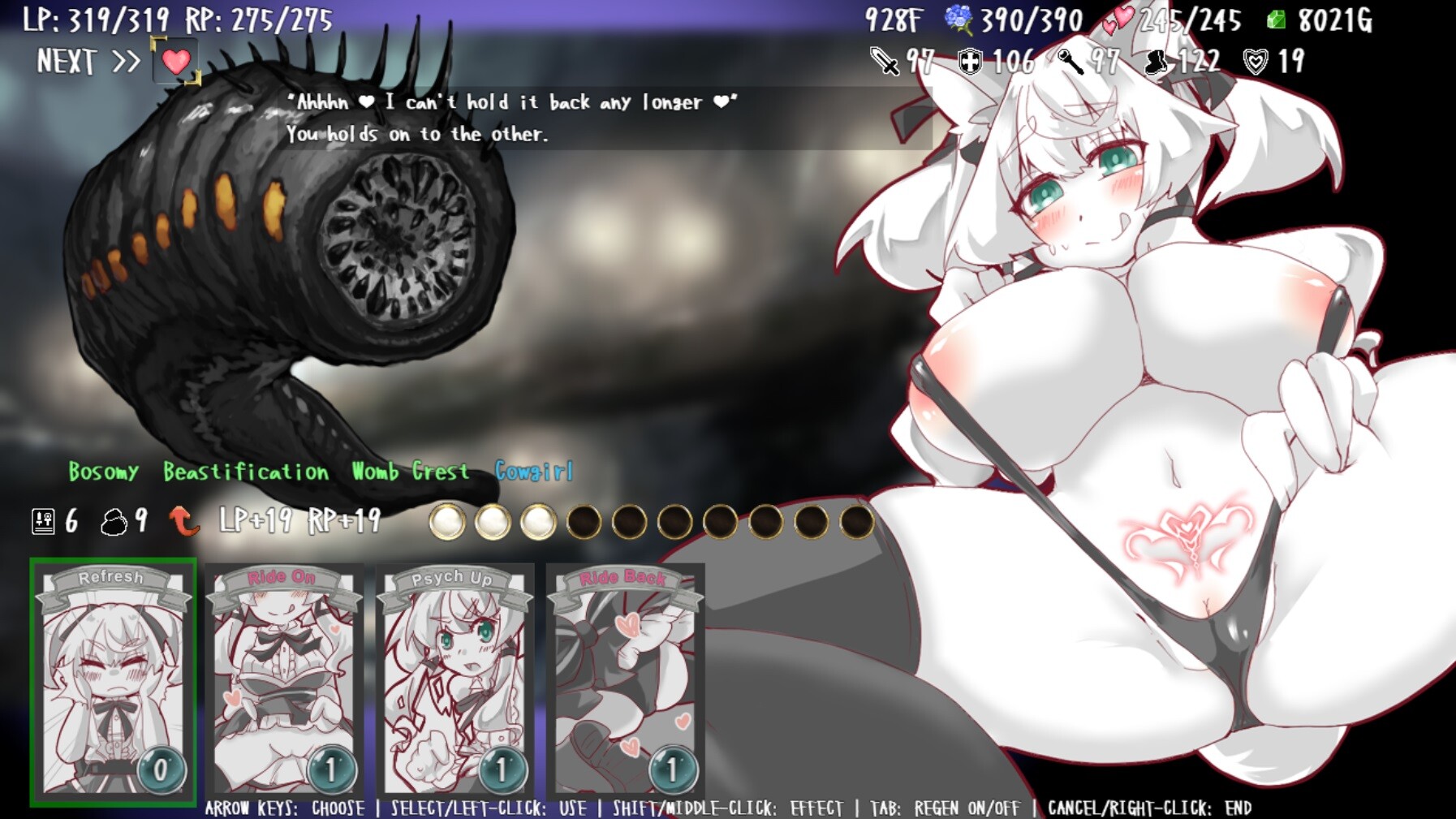 ・6 new monsters. ・Over 10 new cards and new card types. ・New status ailments such as "Time Stop" and "Conception". ・New H scenes. ・New events and endings. ・New items to get new cards or unlock Title.