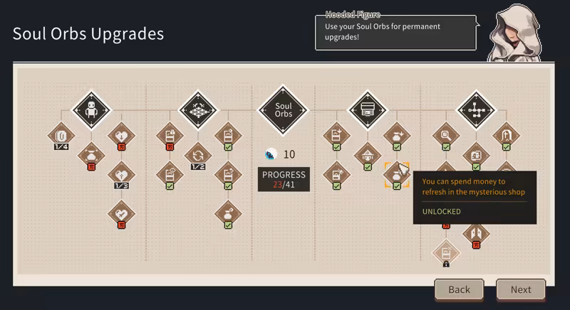 Players earn Soul Orbs from each battle and can use them at the start of the game in the Soul Orb Shop to purchase services. These not only help characters grow but also unlock global rules, making the adventure easier.