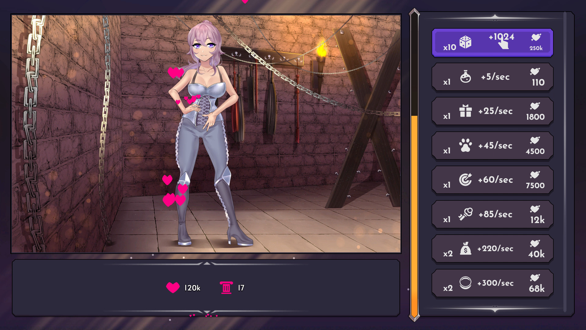 Jagshemash! You like sexy time? I like sexy time too! I show you something. Here is magic click. You use this click, girls show shes vazheen and dance for you. Click-click-click! Very nice, very nice! You click often - the line of romance explosion go up! Wawaweewa! You buy this clicker, you get 10 animated girls with big plastic chests and shave down below in sexy poses. Click-click-click! Elf girl, nun girl, slave-raccoon girl, honey rabbit girl and many others are await to meeting you!! Greatest achievement of all of the glorious Kazakhstani's game dev! You can play this game even if your brother bit your hands off - you need no hands to play! Make girl happy, give her money or give her nice ring and she will take her cloth for you, you don’t press nothing! Chenquieh. High five! Great success!