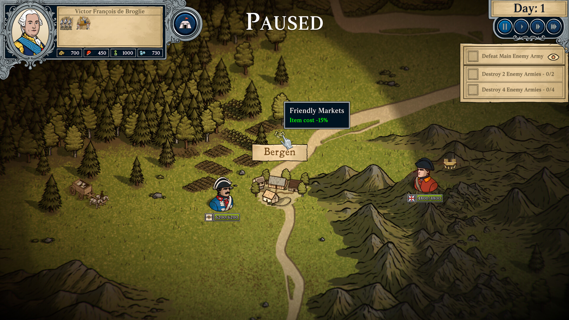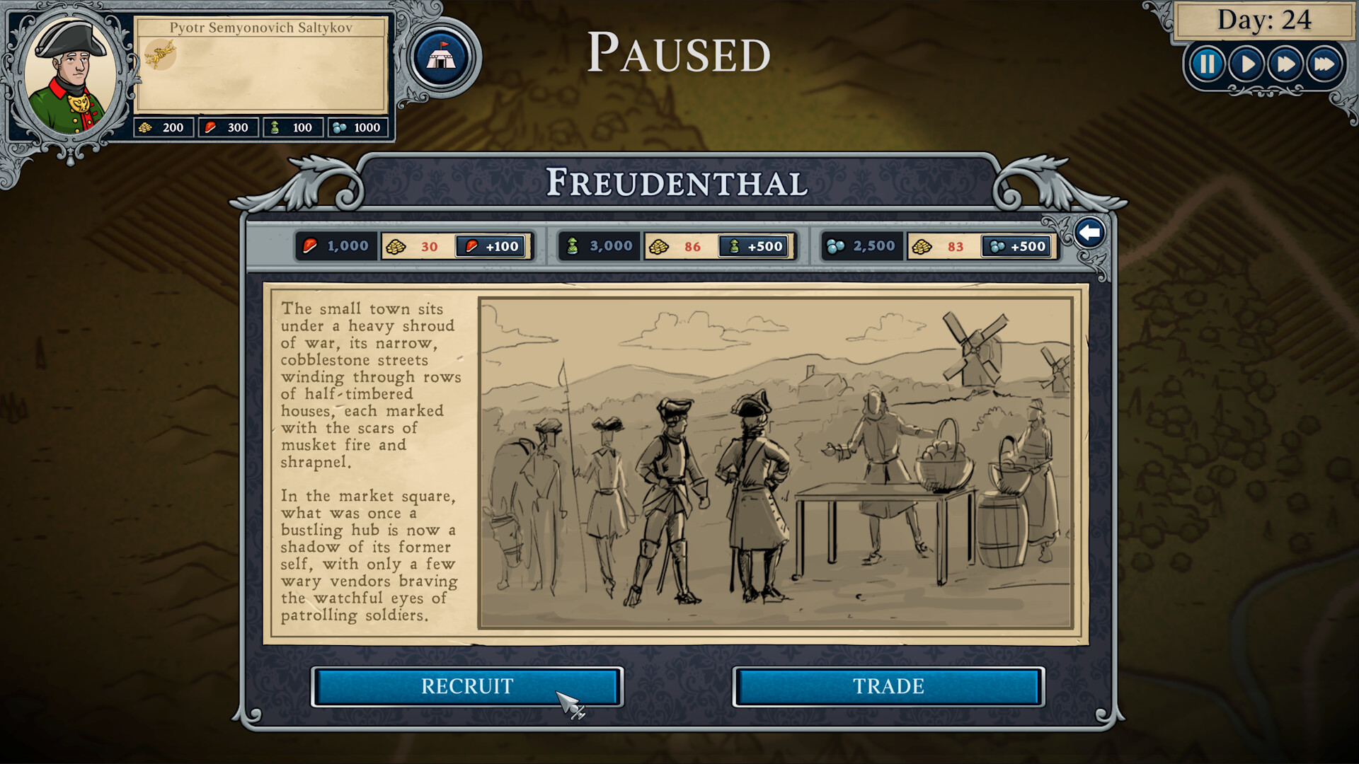 Throughout the campaign, you’ll pass through towns and villages offering a chance to recruit fresh troops, trade for supplies, or offload captured equipment. Some locations specialize in certain goods: artillery, munitions, horses, or officers, while others are picked clean or too wary to help. Prices shift based on your actions and reputation. Raiding a settlement might keep your army alive a little longer, but it’ll close doors elsewhere. Managing your resources is just as important as winning battles, and a poorly timed shortage can grind a campaign to a halt.