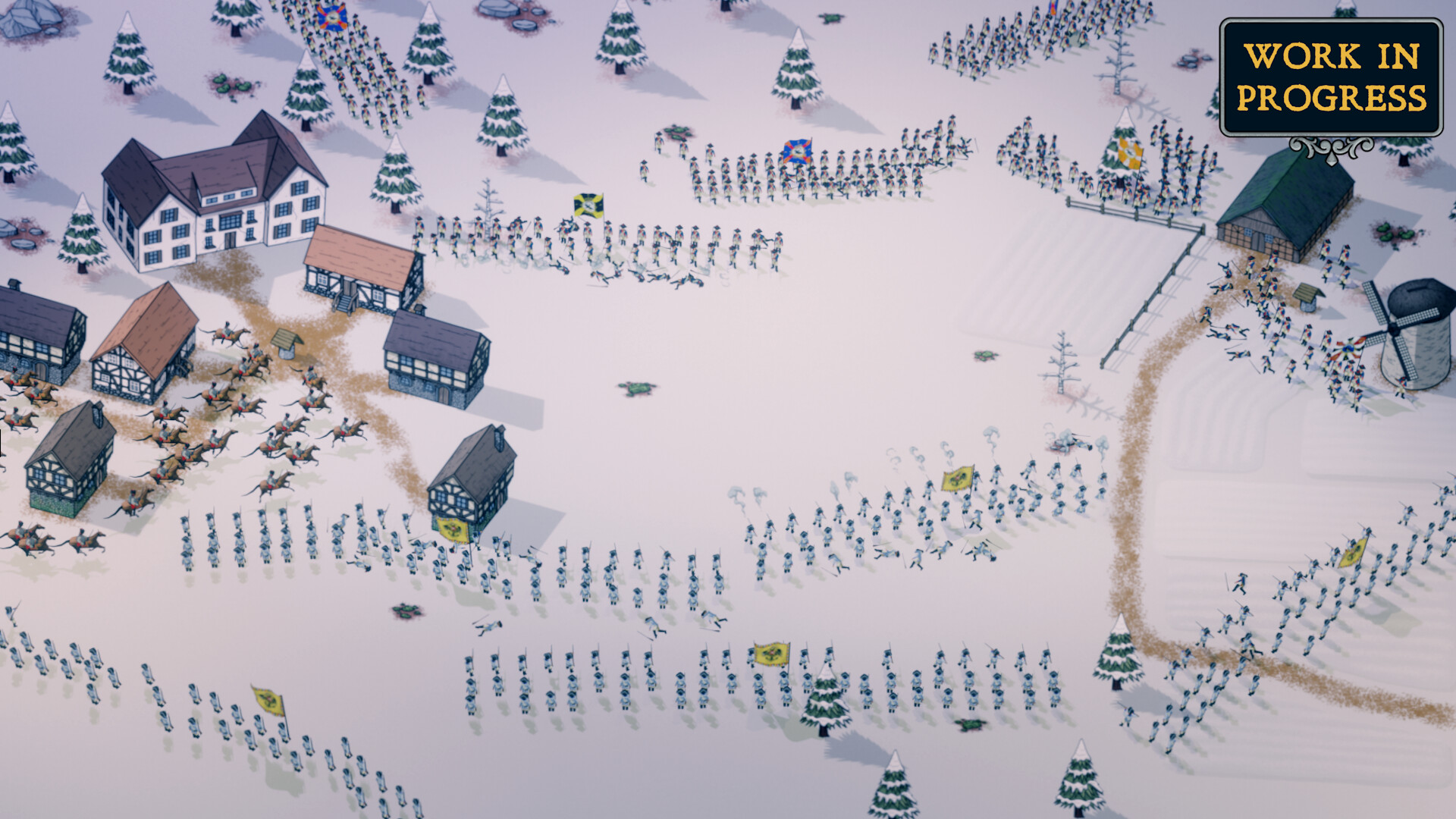 After marching your army into a region, you’ll enter a procedurally generated landscape, obscured by the fog of war and navigated in real-time. Your goal is to locate and destroy the enemy’s main encampment. What lies between you and that objective is different every time: villages, ambushes, battlefield wreckage, wounded survivors, or roaming enemy forces. Terrain affects how fast your army moves, how quickly provisions are consumed, and what kind of battlefield you'll face if attacked. Enemy armies react to your presence, sometimes pursuing, other times reinforcing, or lying in wait. No two campaigns unfold the same way, and no two armies you've led end up alike.