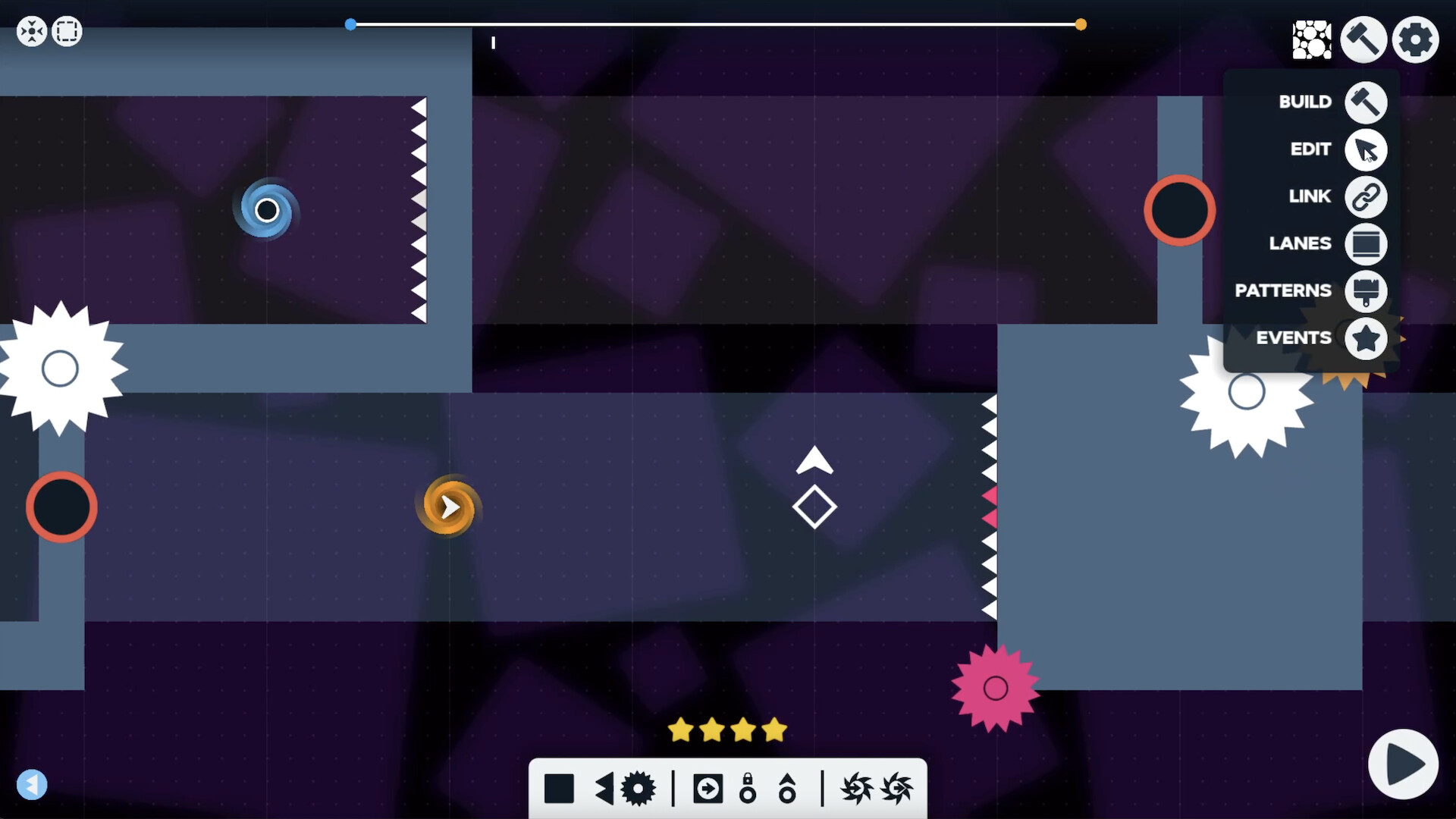 Use dozens of block types, create trigger systems that react to the player and transform your level dynamically, tweak the background visuals to make a nice atmosphere, paint your walls with unique patterns, pick the music you want from the library... and more!