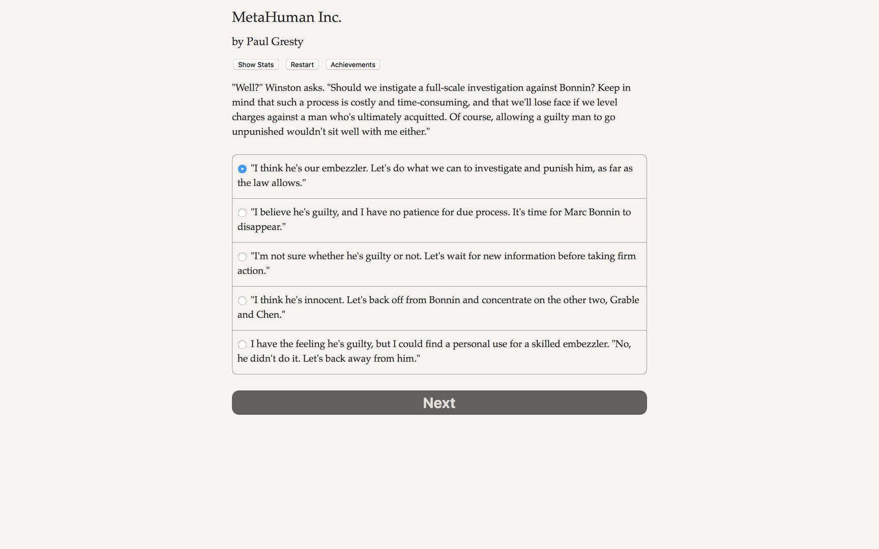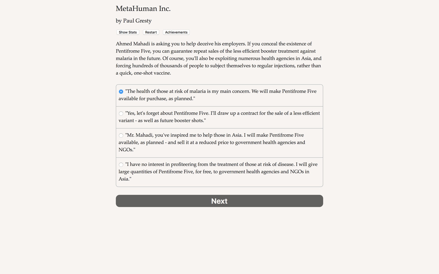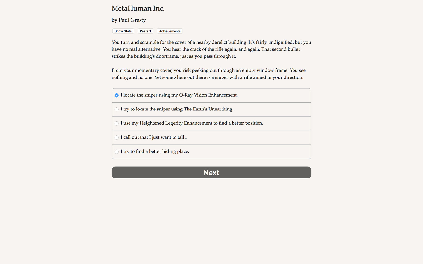 "MetaHuman, Inc." is a thrilling 260,000-word interactive novel by Paul Gresty, author of "The ORPHEUS Ruse." Your choices control the story. It's entirely text-based--without graphics or sound effects--and fueled by the vast, unstoppable power of your imagination.