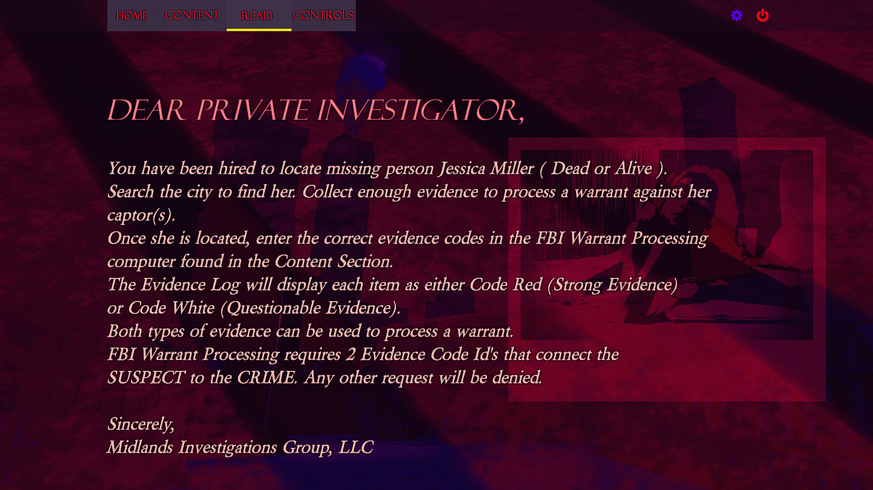Game play mixes elements of first person horror, investigation and exploration. /// Please be advised. This game contains Hallucinations and Jump Scares. /// Backstory : Private Investigator Lance Wells receives credible information on a