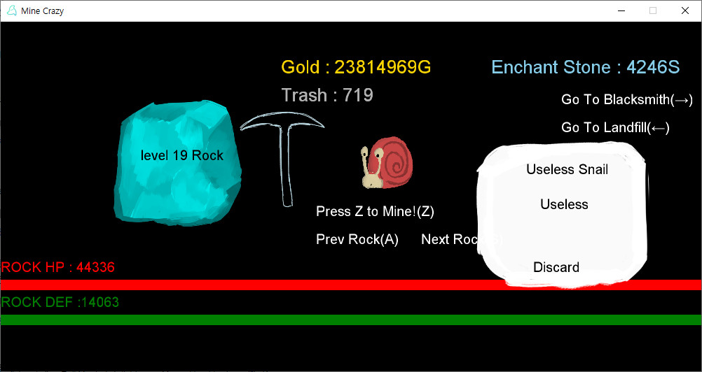 In game, you'll mine rocks, earn money, and reinforce your pickaxe with that money. Reinforcing is probabilistic, so It sometimes blows your mind. Also there are pets(That will improve your mining), And also there is your Waifu, In our proud Gacha system.