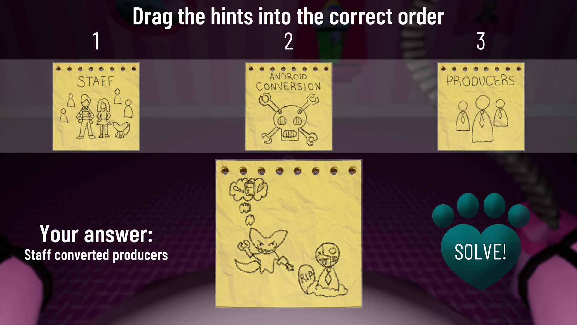 Step back onto the set of Mint's Hints, a cancelled children's TV show. What begins as a curious exploration soon turns into a nightmare. The show's star has been turned into an android. Now deactivated, the android strikes a deal with you to reactivate her.