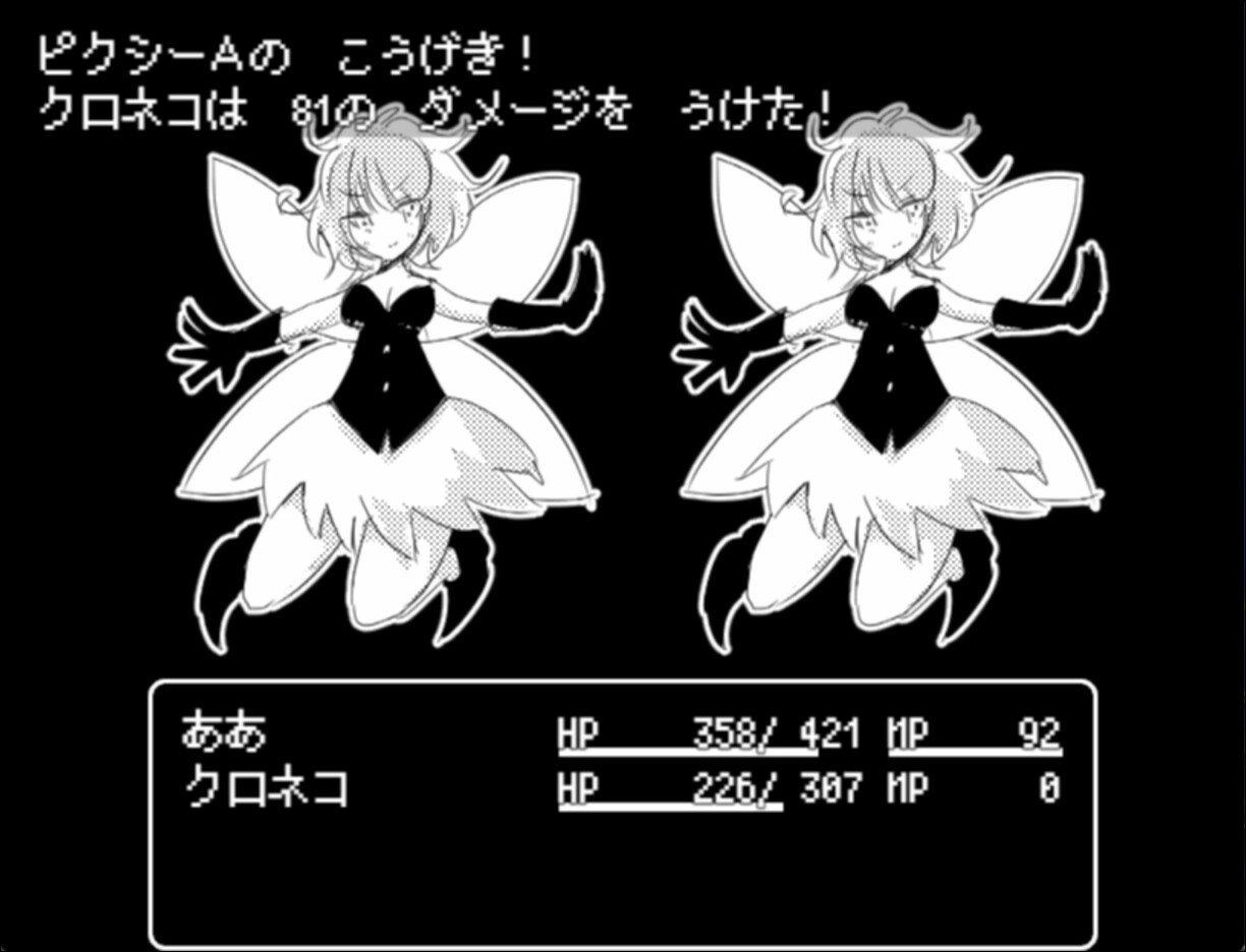 A retro black-and-white RPG. Featuring countless Mon-Musu! Fight them, add them to your team, and beat the Dark Lord!