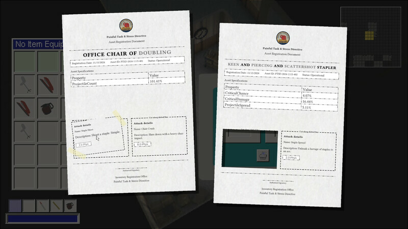Mix and match weapon attacks from an absurd array of office supplies, like staplers that shoot paperclips and coffee pots that explode into scalding showers of coffee. Every weapon can be customized, with basic and advanced attacks ready to swap for endless playstyles.