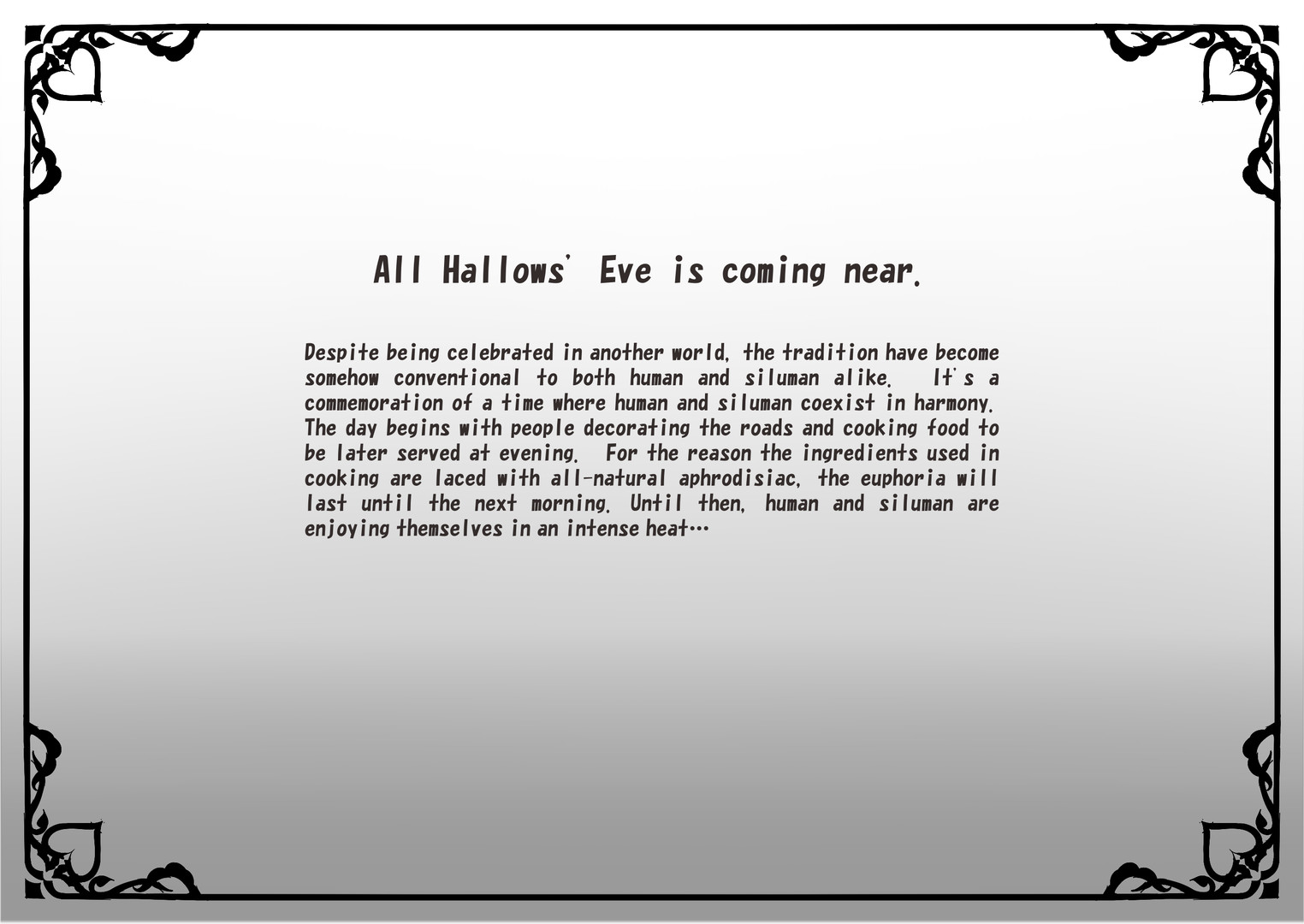 Despite being celebrated in another world, the tradition have become somehow conventional to both siluman and human alike. It’s a commemoration of time where human and siluman coexist in harmony. The day begins with people decorating the roads and cooking food to be later served at evening. For the reason the ingredients used in cooking are laced with all-natural aphrodisiac, the euphoria will last until the next morning.