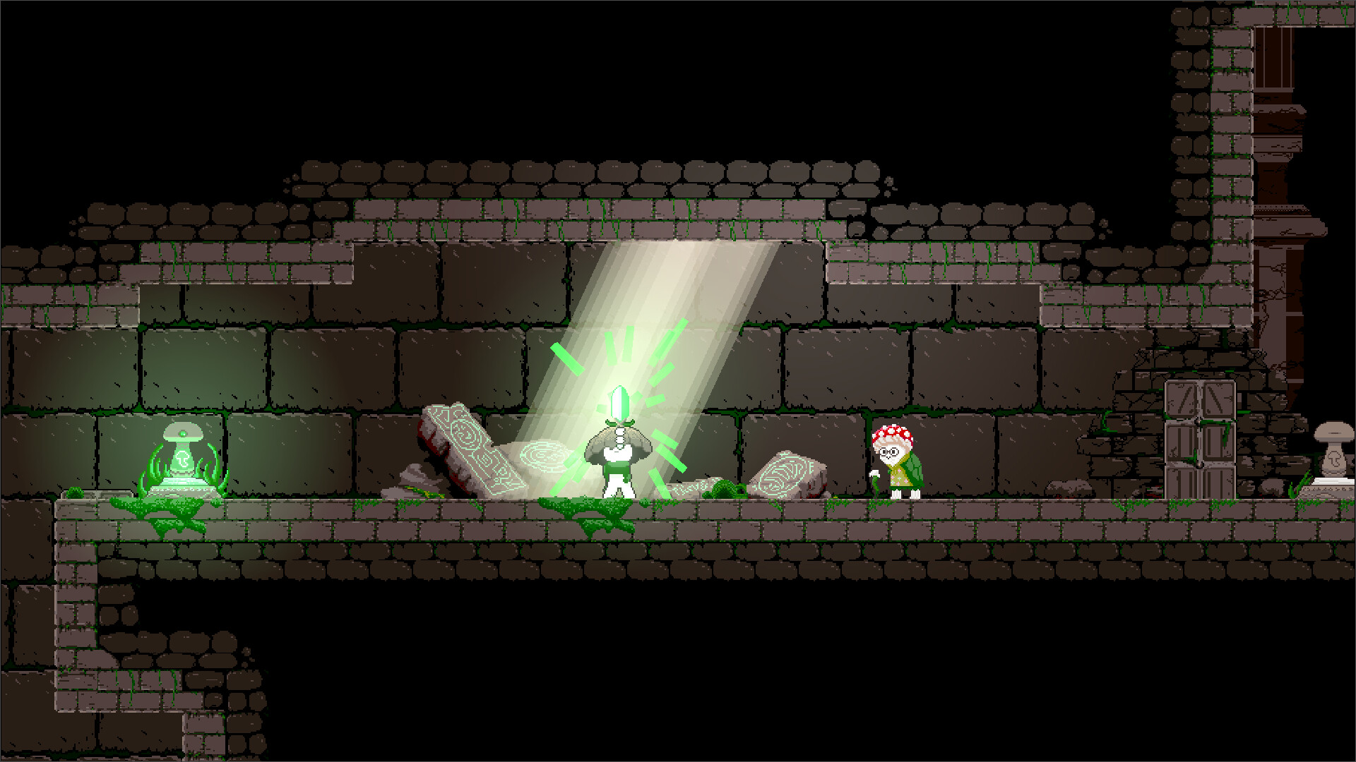 The Blade of Grass is a unique weapon that can be rotated at any angle the player desires, allowing Mica to be pulled over obstacles. Combining this with Mica's jumping and gliding abilities creates a platforming experience like no other. Mica must time his jumps and angle the blade to overcome challenges and traverse a mystical world, meeting several wacky mushrooms and growing the sword to comical lengths along the way.