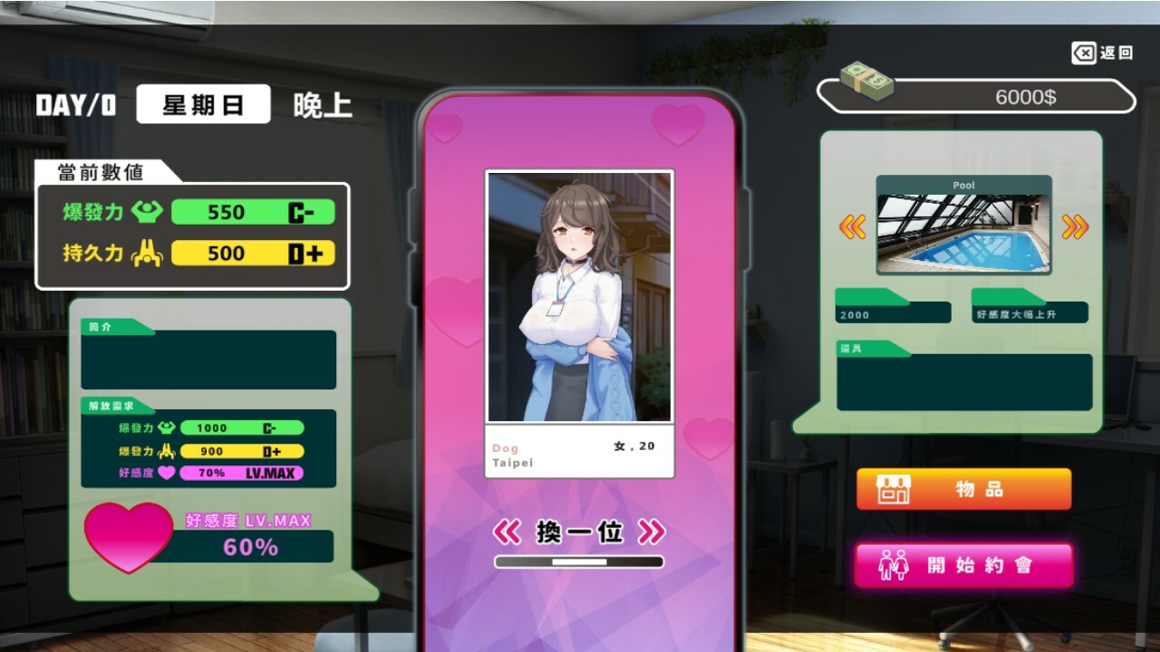 Hookup can only be conducted at night. You can take the other person to different dates to increase your favorability, and finally push them into bed to accumulate practical experience.