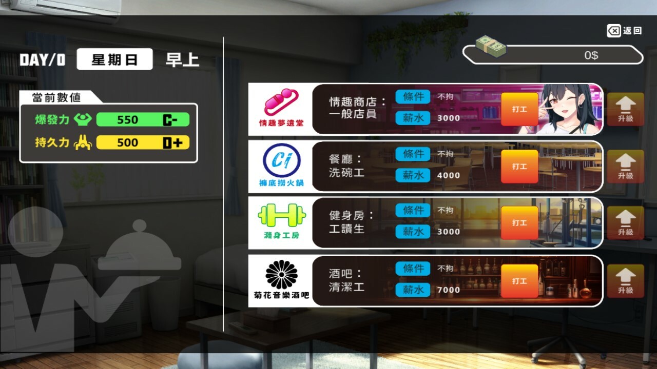 During each period, players can choose one action from Work, Training, or Hookup, which is only available at night.