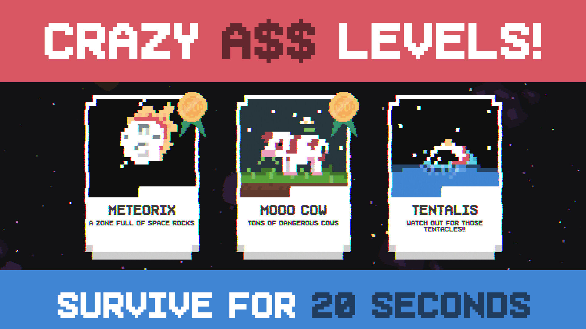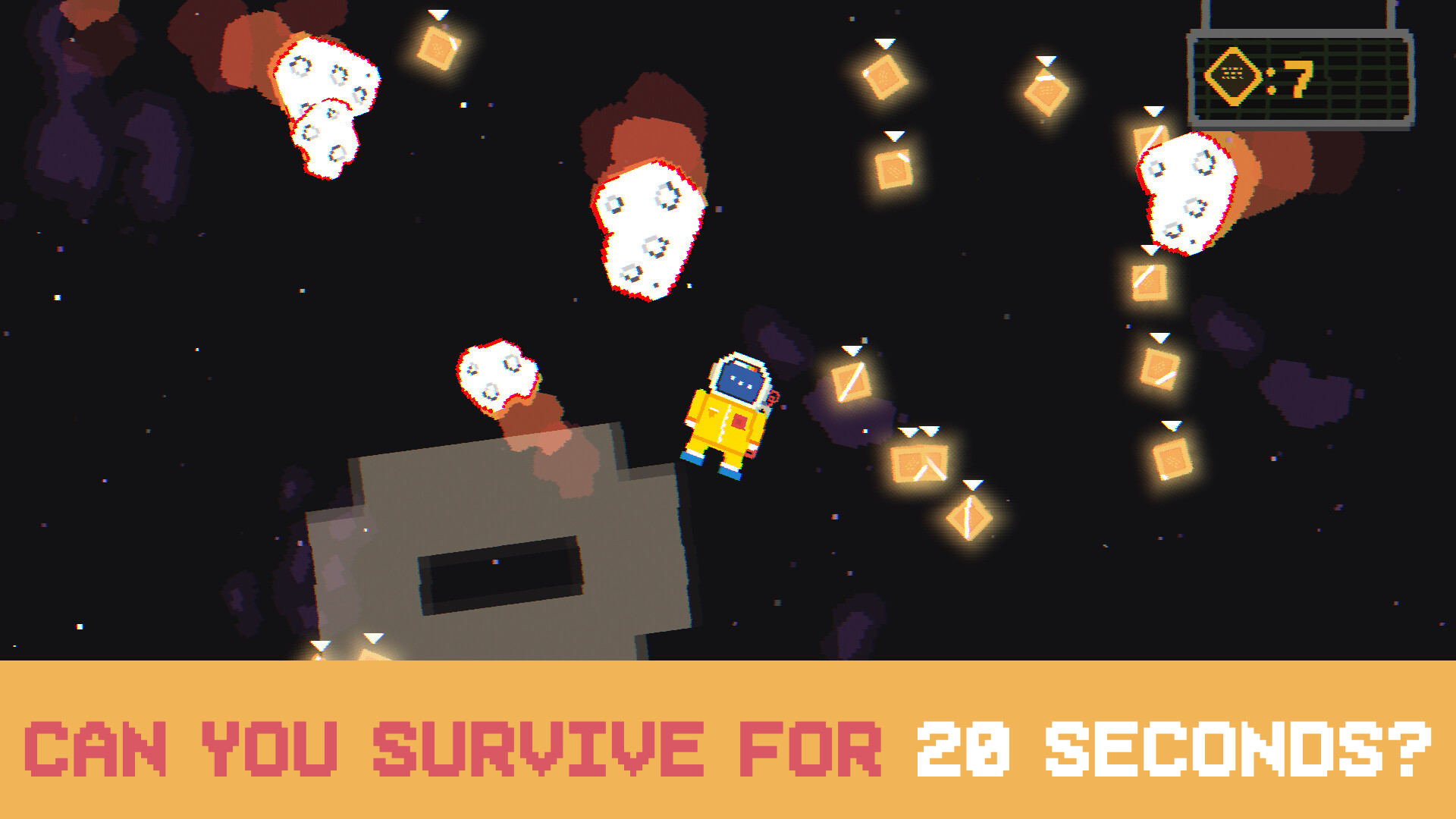 In My Last 20’s Missions, you’ll face 20 seconds of pure arcade madness. Asteroids? Cows? Tentacles? Each chaos zone is different with it's own difficulty and only the fastest astronauts will make it out alive.