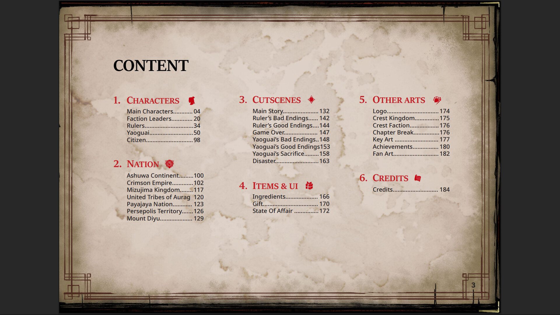The My Lovely Empress artbook showcases the visual development of the continent of Ashuwa and the many people (and Yaoguai!) that dwell inside it. Gain an in-depth understanding of My Lovely Empress with these insights into the design process behind characters, nations, and more as you witness Game Changer’s biggest title yet!
