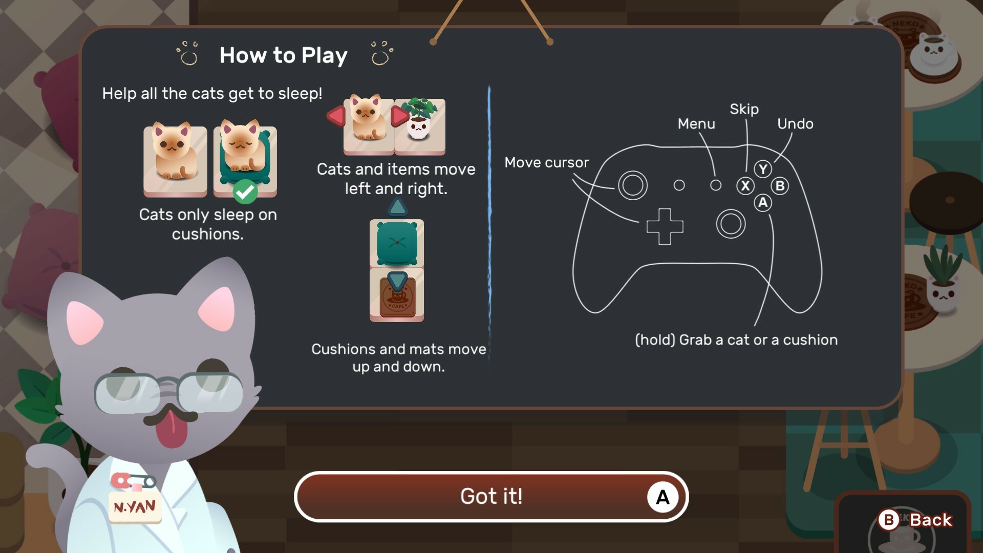 Cats only sleep on cushions. Complete a level by helping all cats get to sleep.