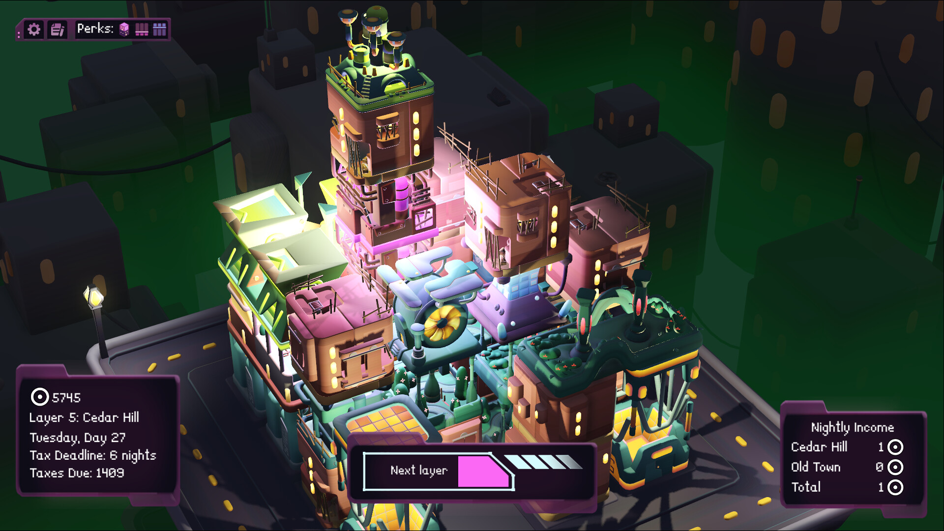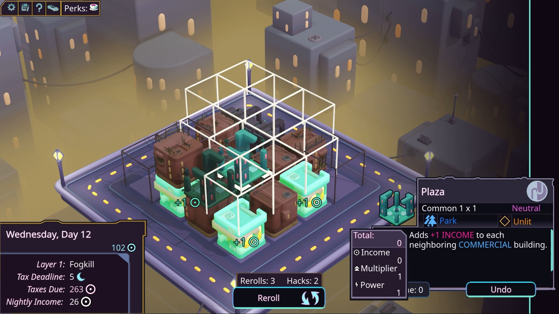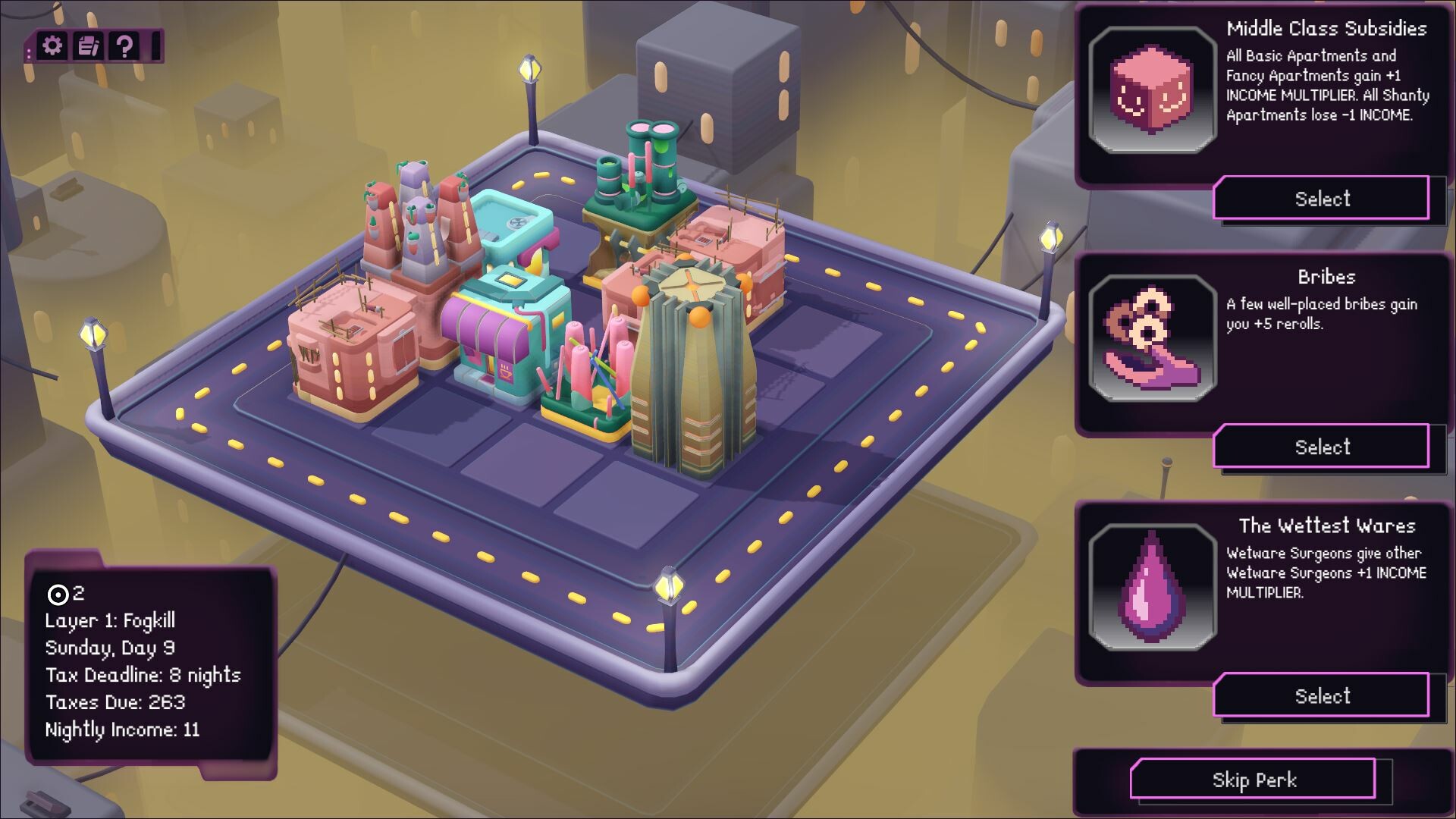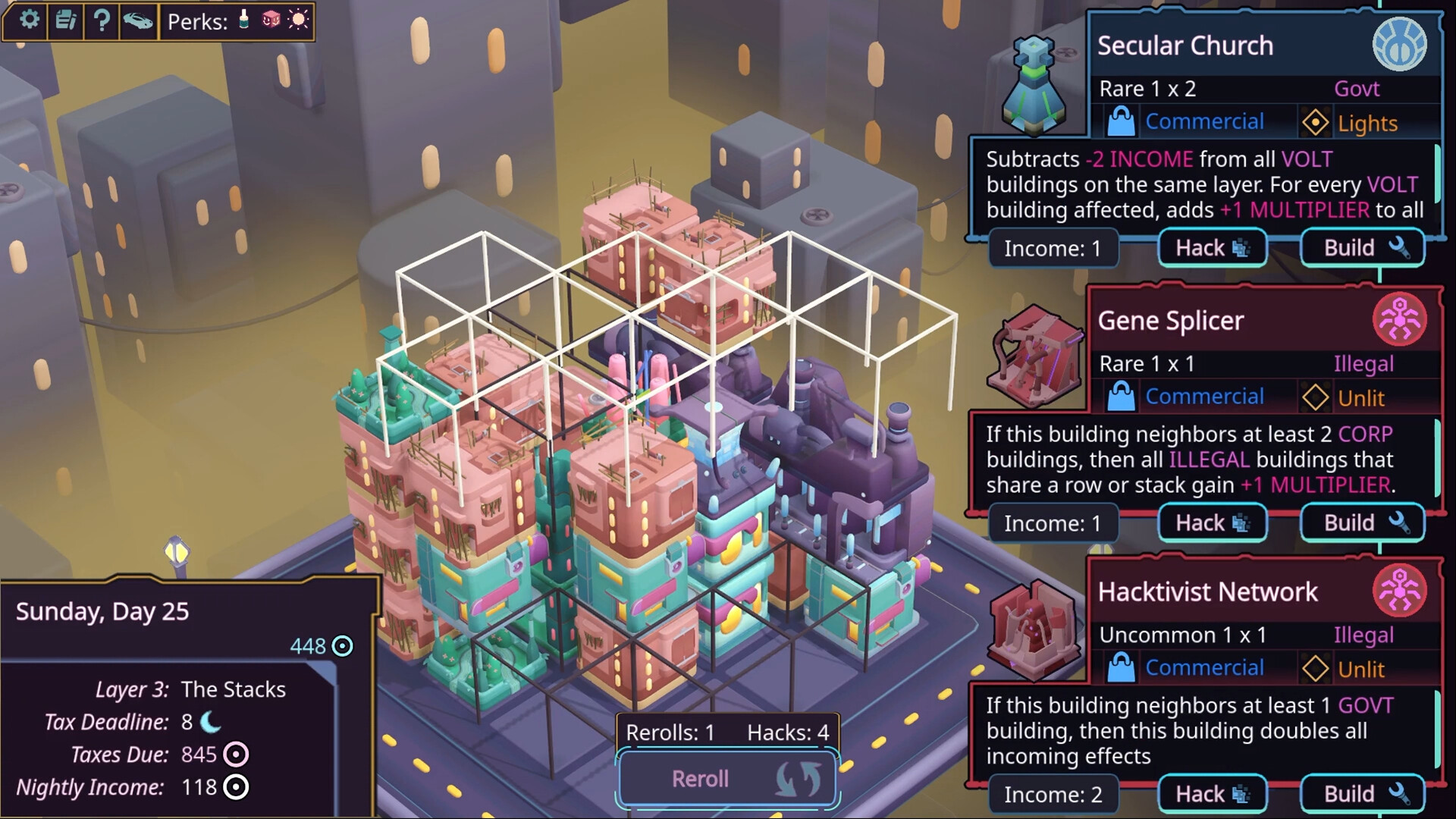 A minimalist cyberpunk city builder inspired by Islanders and Luck Be a Landlord.