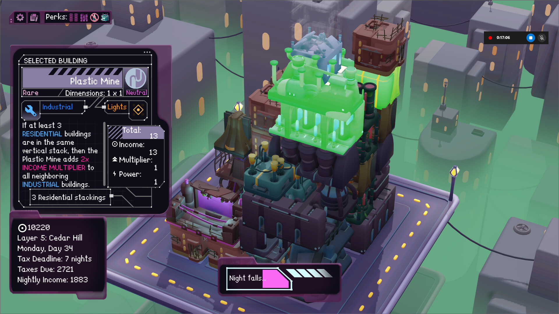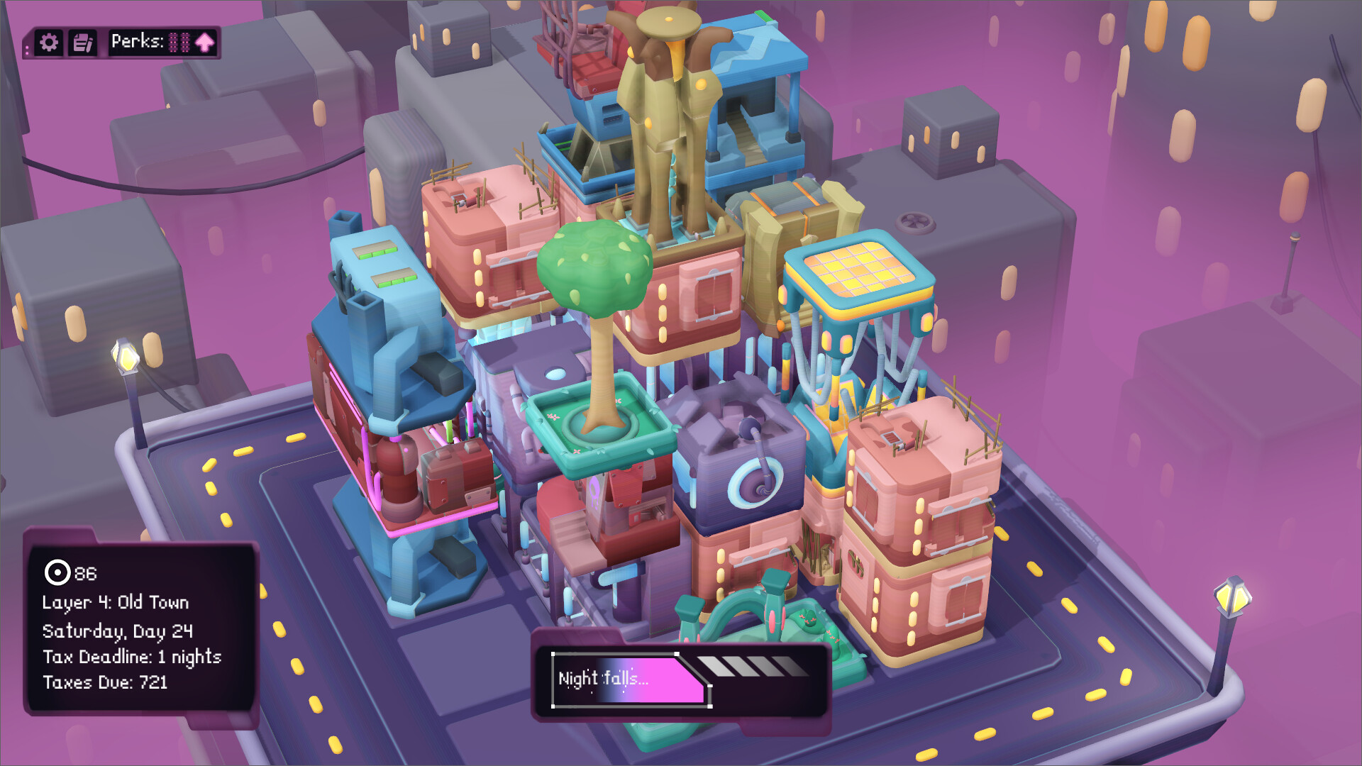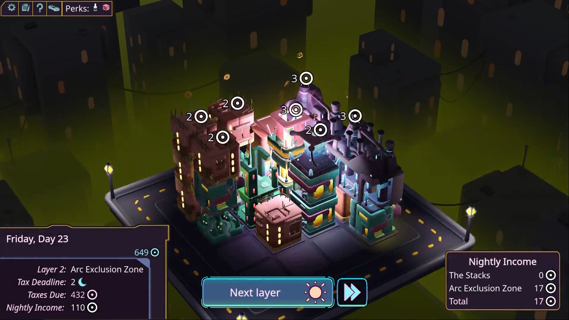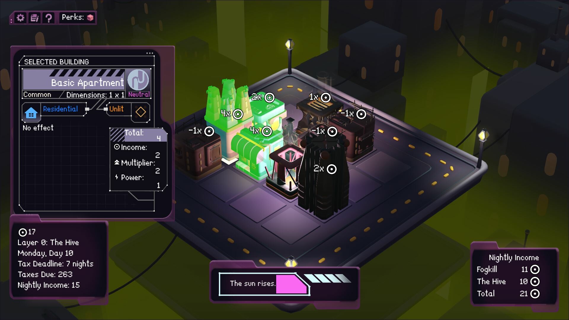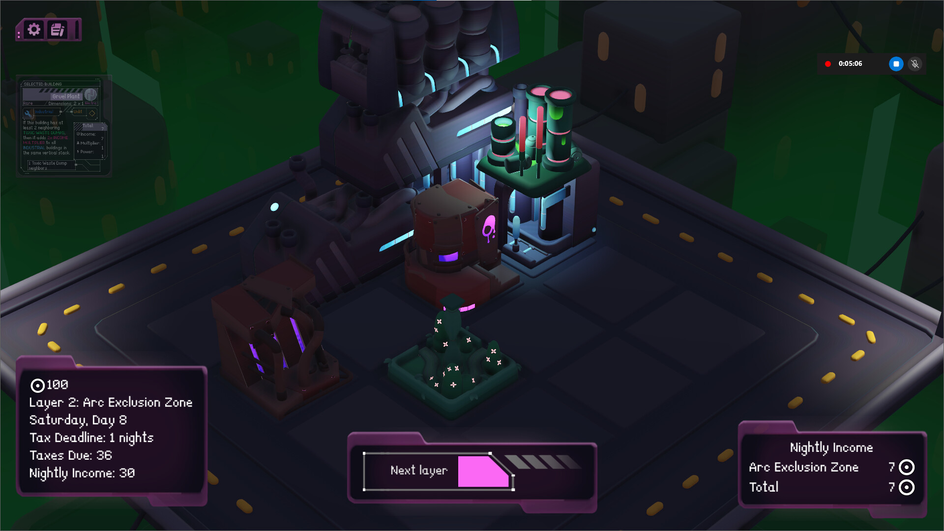 A minimalist cyberpunk city builder inspired by Islanders and Luck Be a Landlord.