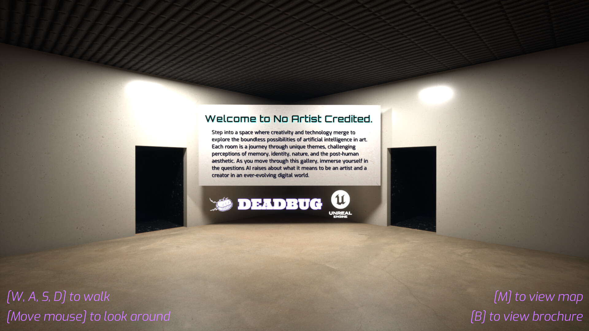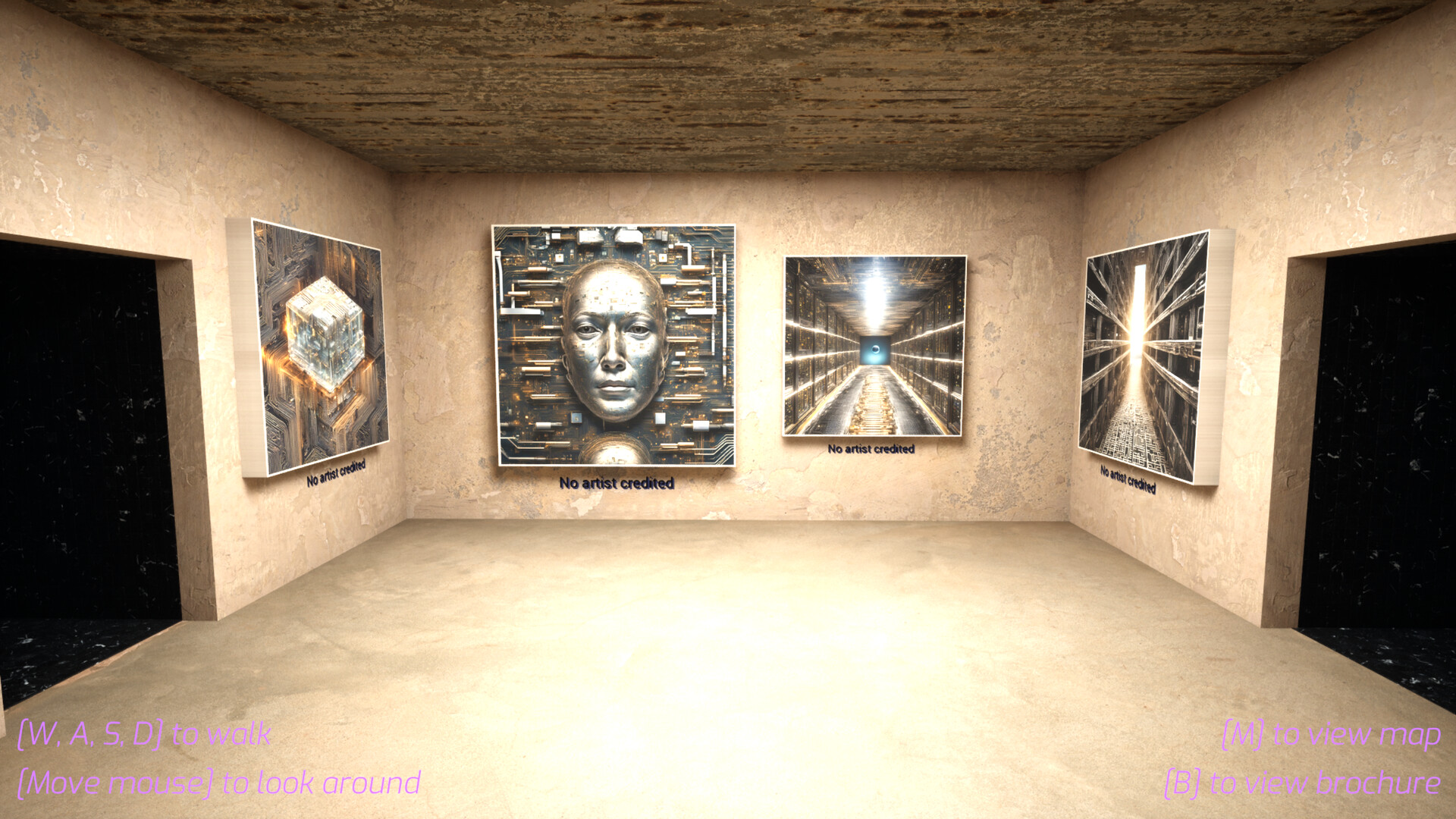 No Artist Credited is a virtual art gallery and an experiment in the capabilities and limitations of AI tools. The entire gallery was designed using instructions, themes, and art generated by one of three AI.