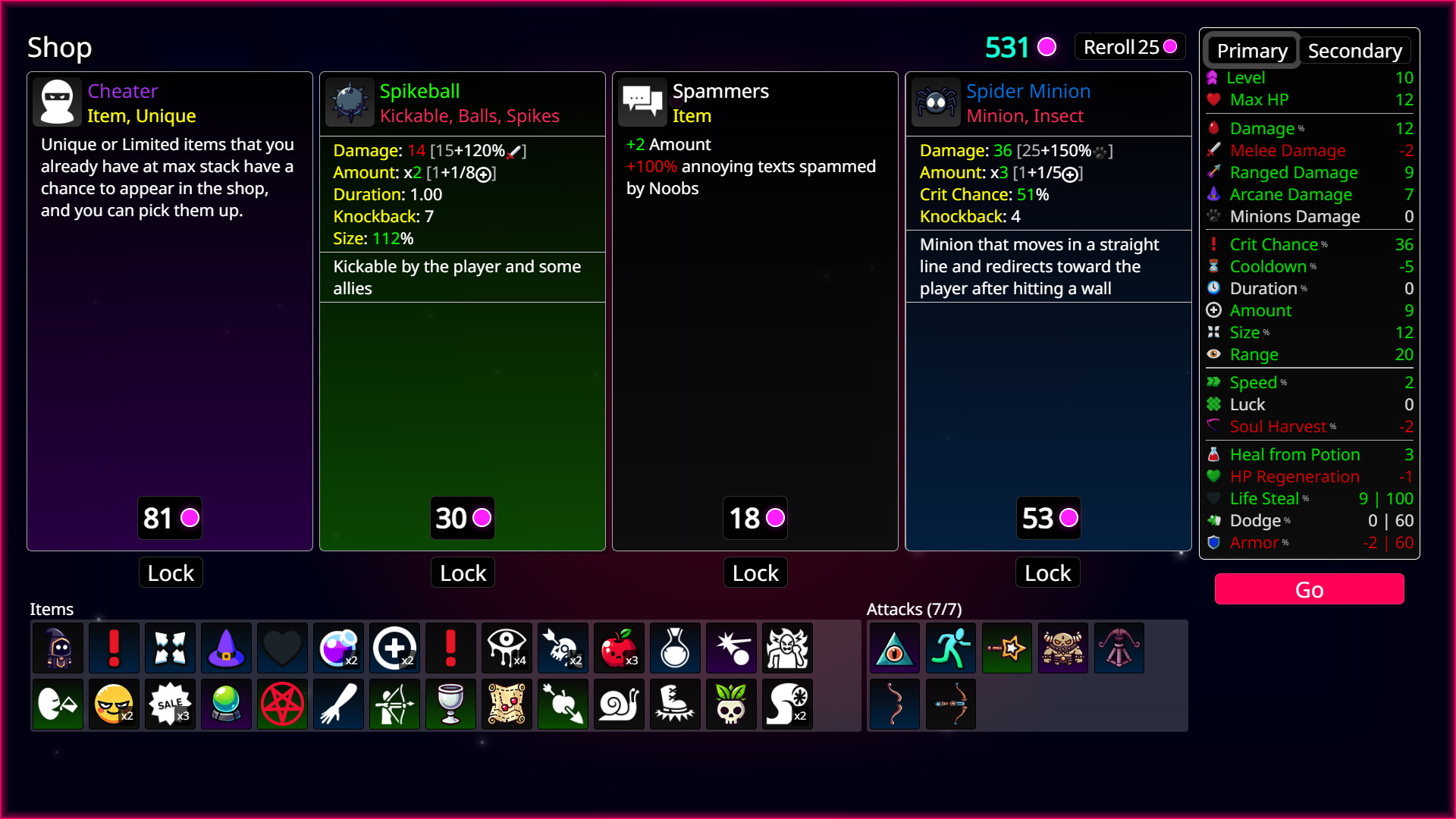 Break the Game: Push your Amount or Size stats to absurd levels and watch the screen explode in chaos! Use the Cheater Item to stack unique items multiple times