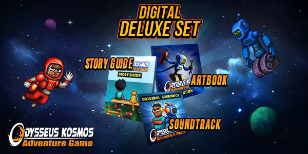 Odysseus Kosmos and his Robot Quest is the game that pays homage to good old adventure games of the golden era and the elements of sci-fi in popular culture. This digital art book (pdf format) contains pages full of concept art and sketches — everything that helped create the fascinating (and occasionally tragic or humorous) world of Odysseus Kosmos.