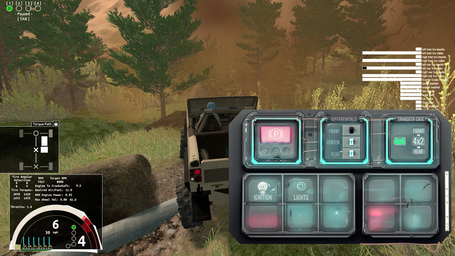 Complex suspensions, permanent environmental changes, vehicle damage and crunching, terrain modification with ruts and tracks, soft body deforming tires over rocks, a driver that's fully physically simulated, trash to pick up and robots that try to murder you all while carving your own paths across a nearly dead, dystopian earth. Offroad your way across rocky plateaus, over islands, deep in forests, through caves, above toxic fog, on mars and who knows where else, to build new paths and begin cultivating a vibrant future.