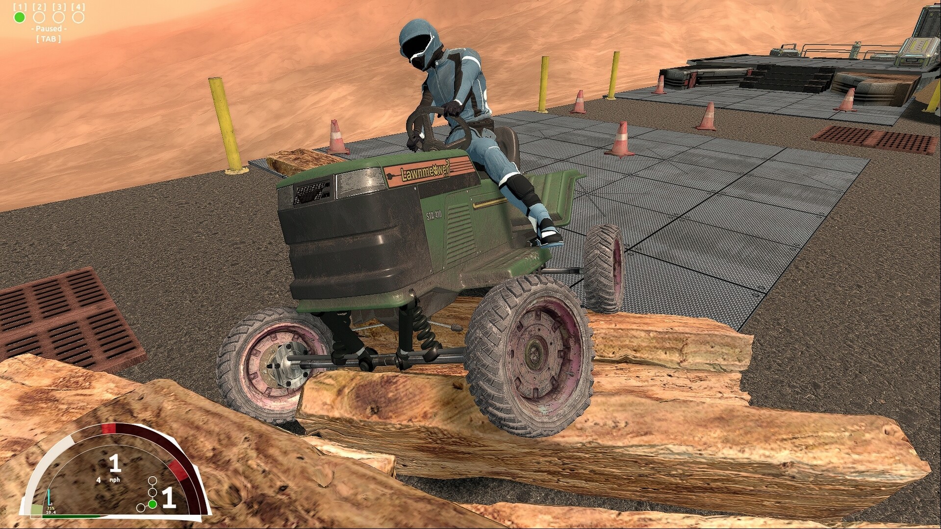The driver is always simulated fully with physics, flexing their muscles to stay in position and hold on to that steering wheel. They have an air level that is hindered by a trash filled area, and a requirement of nutrition that, while easy to maintain, can become dire in a bad situation. They can even be knocked unconscious with a hard enough impact to their head, which in the wrong situation while driving can send you careening out of control. But once you wake up again, you can regain control of the vehicle as long as you can get one hand back on the steering wheel.