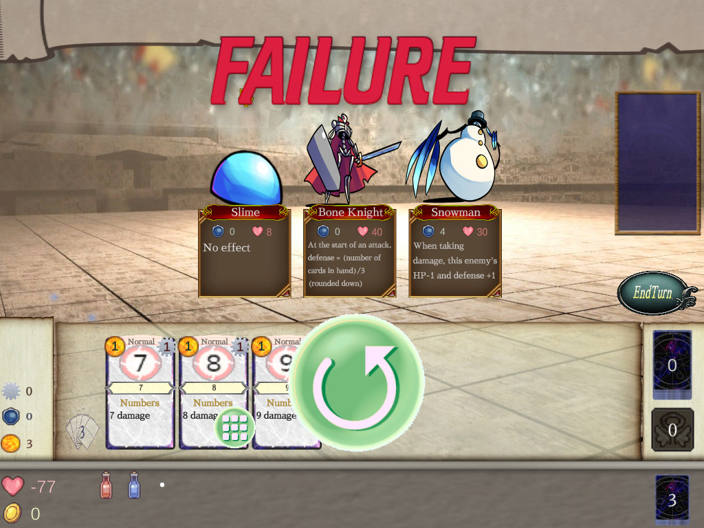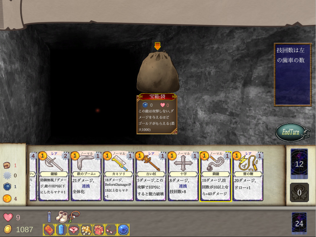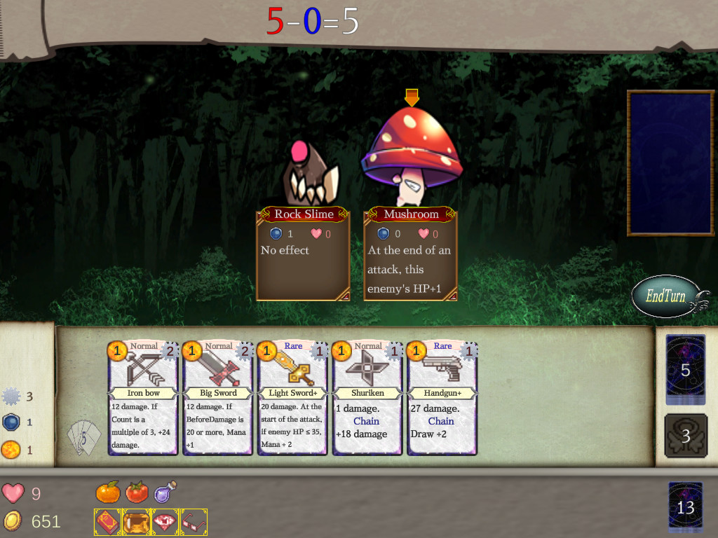 .A puzzle mode is implemented, which is rare in deck-building roguelikes. Try to reduce the HP of enemies a little different from usual to just 0 by using the decided cards. There are a total of 30 puzzle problems. Try to solve all of them, which gradually become more and more difficult.