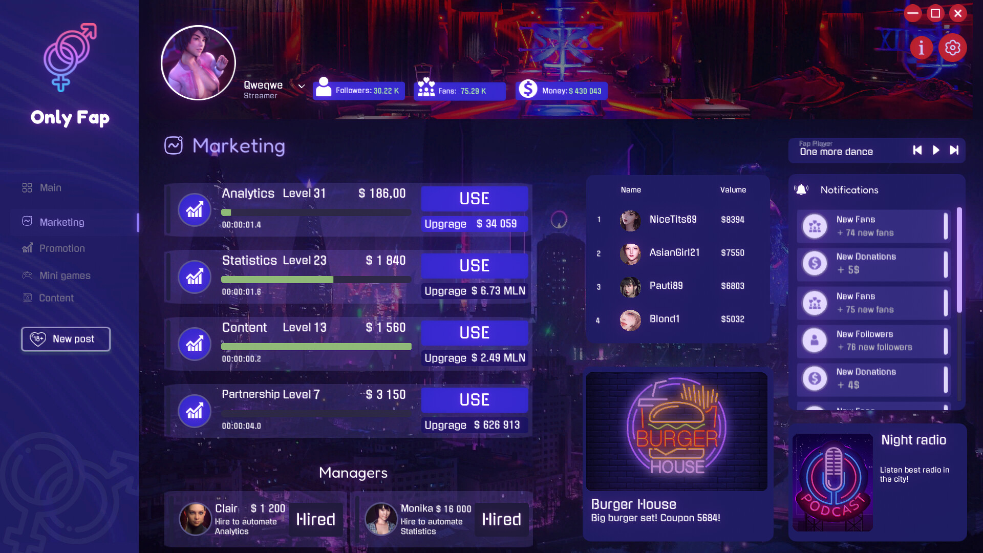 OnlyFap Simulator 4 is a casual clicker adult game that looks like a popular social media.