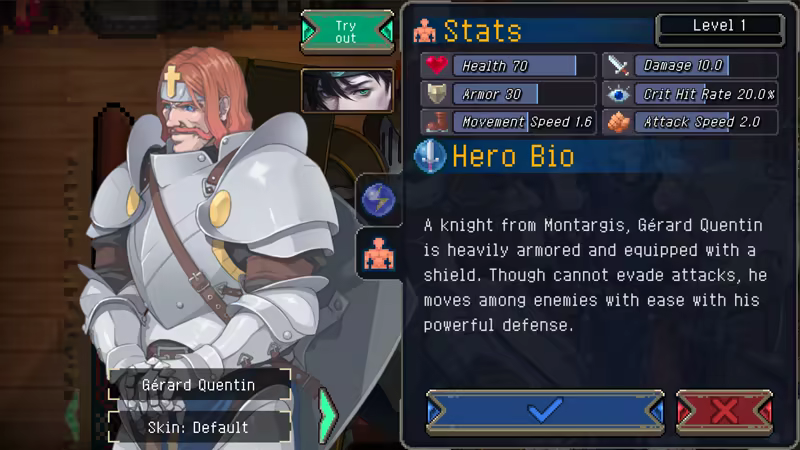 A knight from Montargis, Gérard Quentin is heavily armored and equipped with a shield. Though cannot evade attacks, he moves among enemies with ease with his powerful defense.
