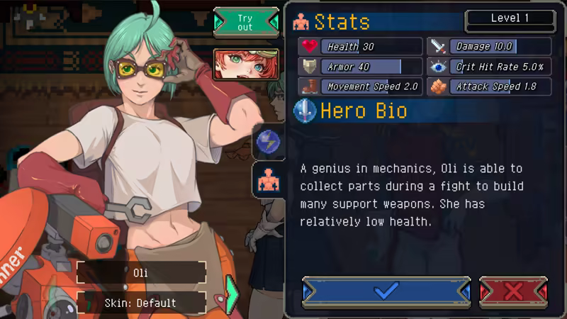 A genius in mechanics, Oli is able to collect parts during a fight to build many support weapons. She has relatively low health.