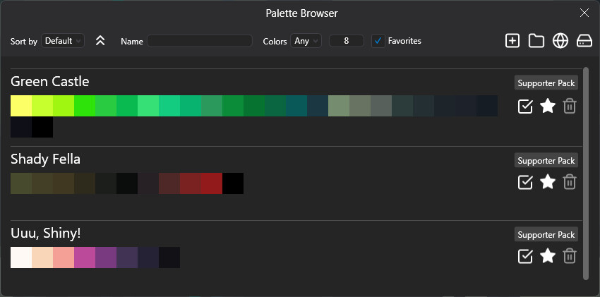 Founder's Pack is a bundle that gives you a head start in PixiEditor with 21 handcrafted color palettes, 4 ready-to-use workspaces, and a special in-app badge that proudly shows you're supporting the project.