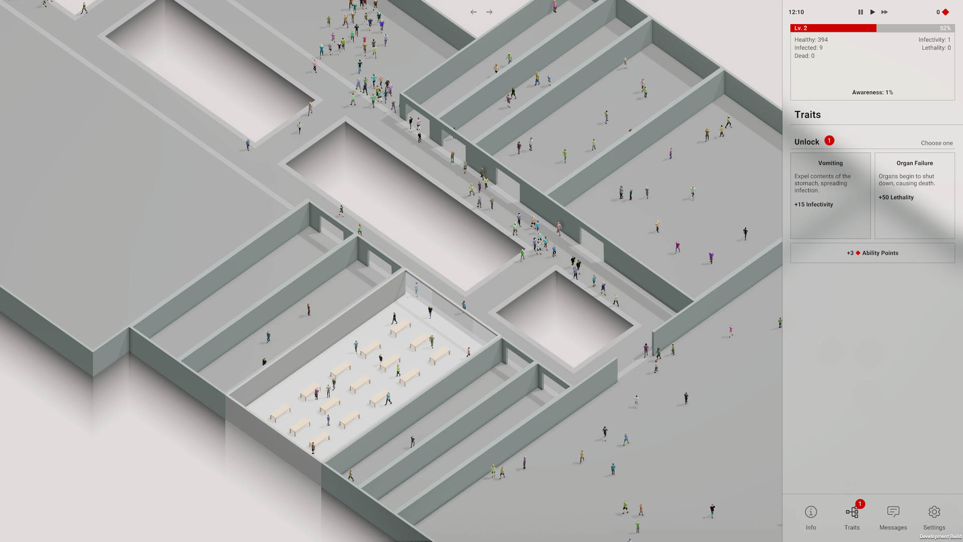 Shape the disease by evolving traits, from how fast it spreads to how it changes shopper behavior - making them hungrier, slower, or more panicked.