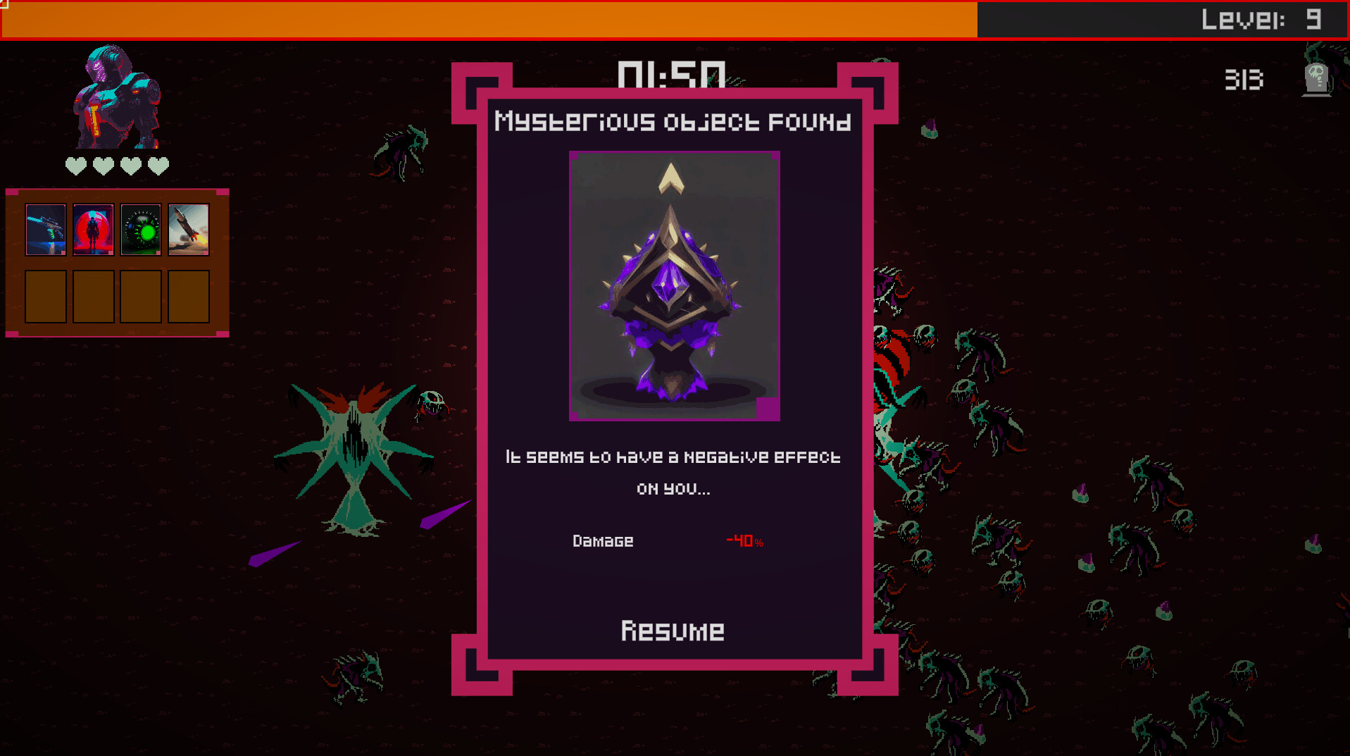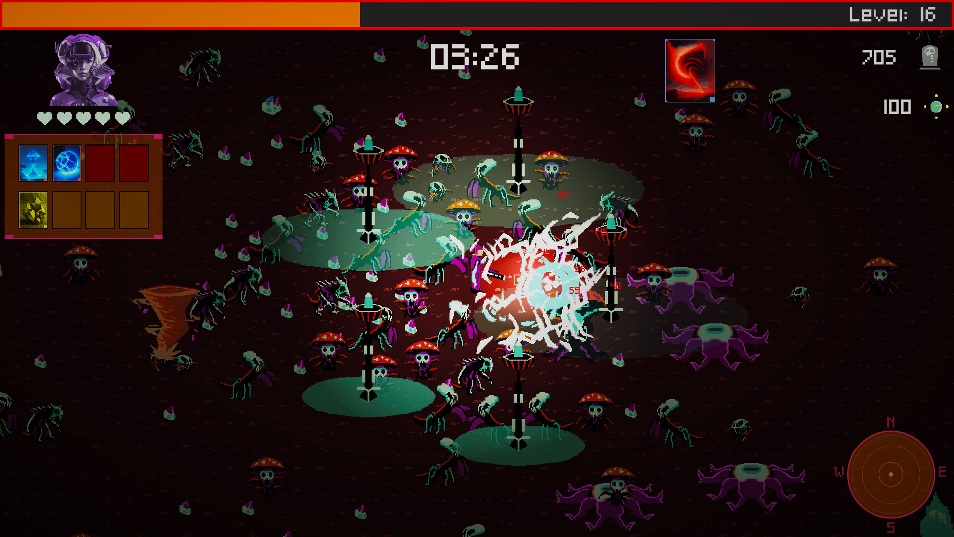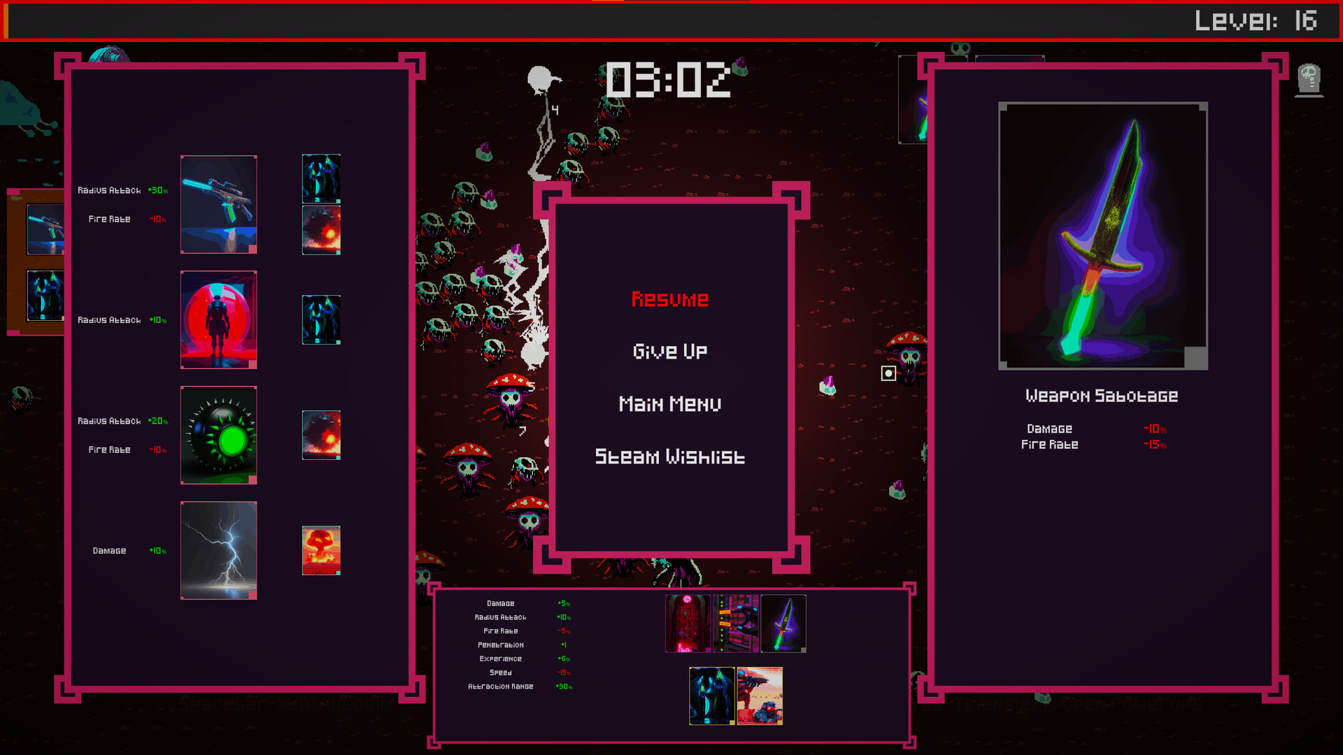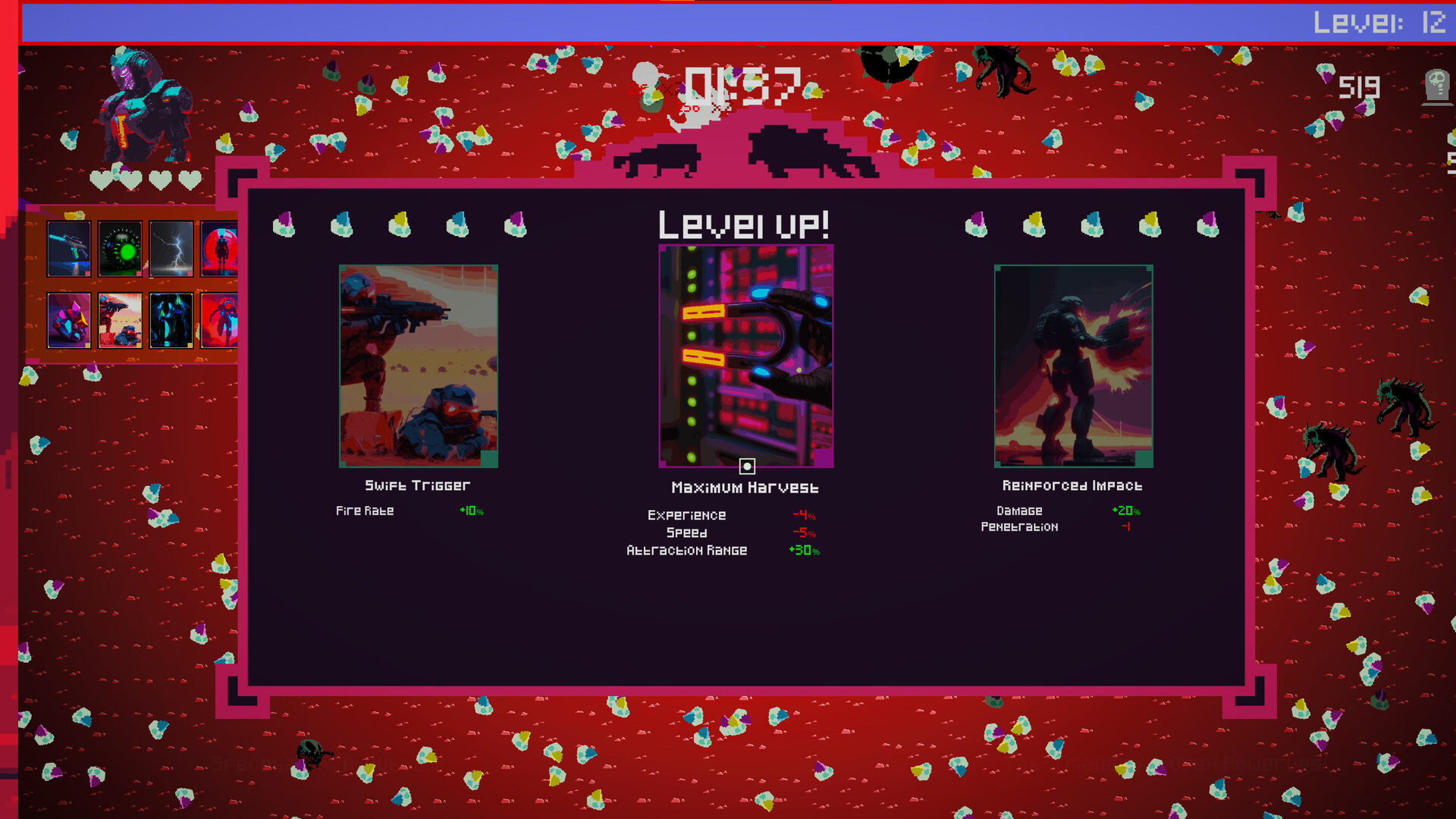 Delve into action Choose your weapon and start eliminating aliens! Collect experience and level up. With each level-up, you'll select a card drawn from your deck. Note: pay attention to card requirements. The effect will not be applied if the requirements are not met. Everything is a resource: your lives, the number of enemies defeated, money collected, and crystals gathered. All of these can be utilized by cards for their effects.