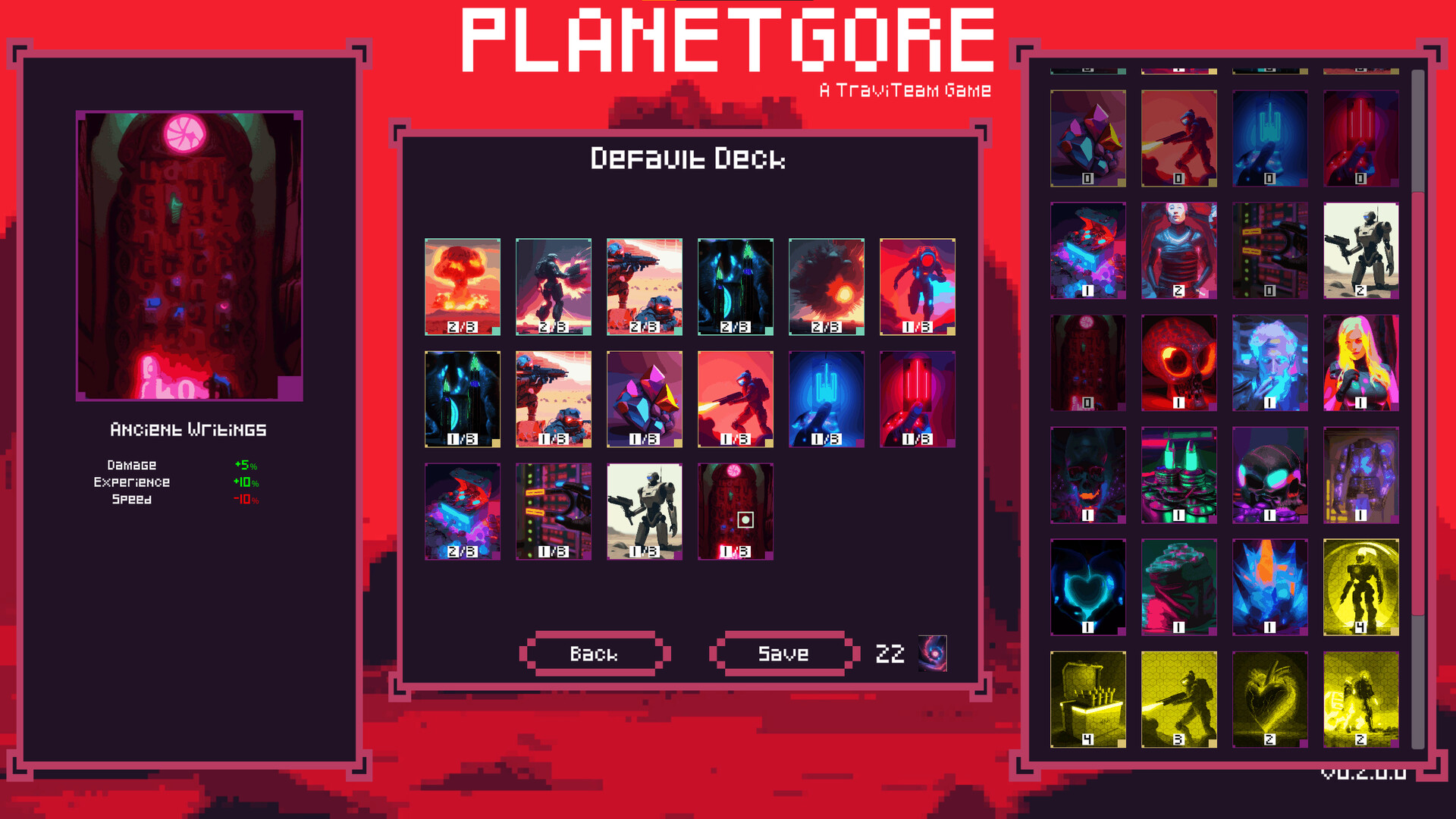 Planetgore is a roguelite deckbuilding game where you use cards to customize your weapons, empower yourself, and chain them together to wield incredible power against aliens. Choose a hero, each with unique weapons and skills, and try to survive waves of deadly aliens. Select your cards with care before setting out to eliminate the alien threats. Experiment with various strategies by combining different types of cards.