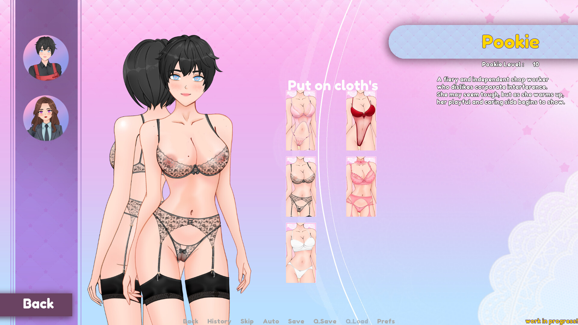 Pookie's Lingerie Shop is a short and simple flirty lingerie shop dating sim with light management elements. As a corporate-assigned manager, you’ll work with the sharp-tongued Pookie, handle quirky customers, and meet the mysterious collection officer Regina. Your choices shape relationships and lead to multiple romantic paths. Will you boost sales and find love—or cause chaos in the shop?