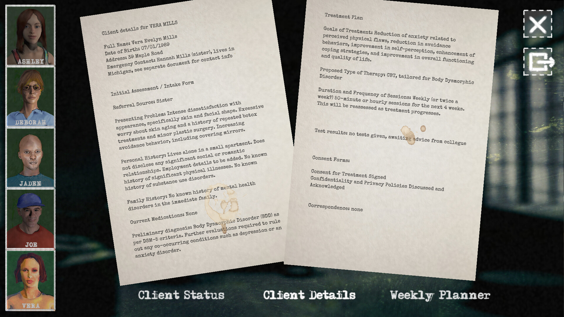 Step into the shoes of a psychologist at a small firm, specializing in treating various phobias. Managing your clients is hard enough. Vera Mills won't look at herself in the mirror. Jaden Thompson's social life suffers because of his fear of heights. And Ashley Taylor is obsessed with the thought that she's psychotic like her mother.