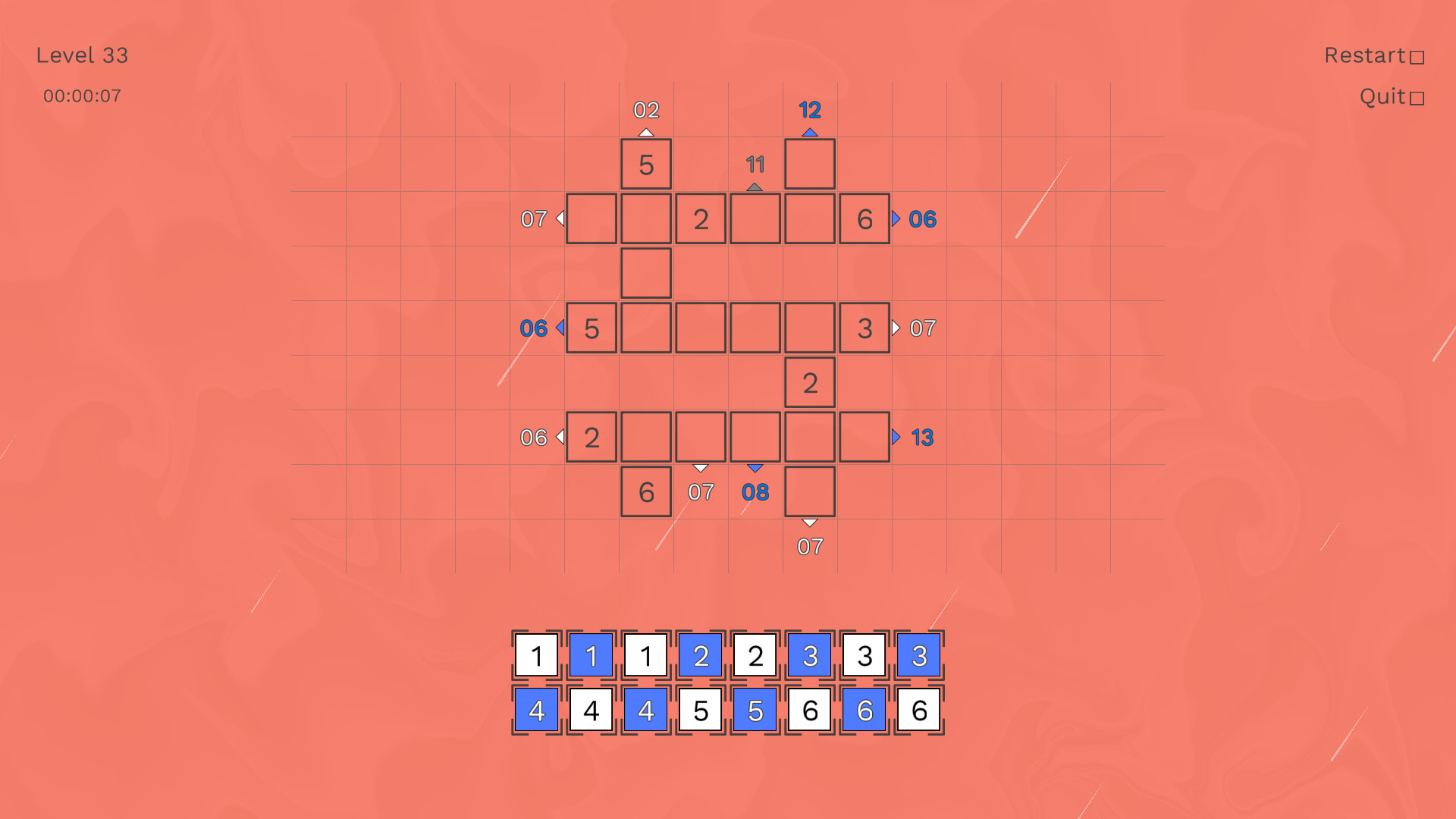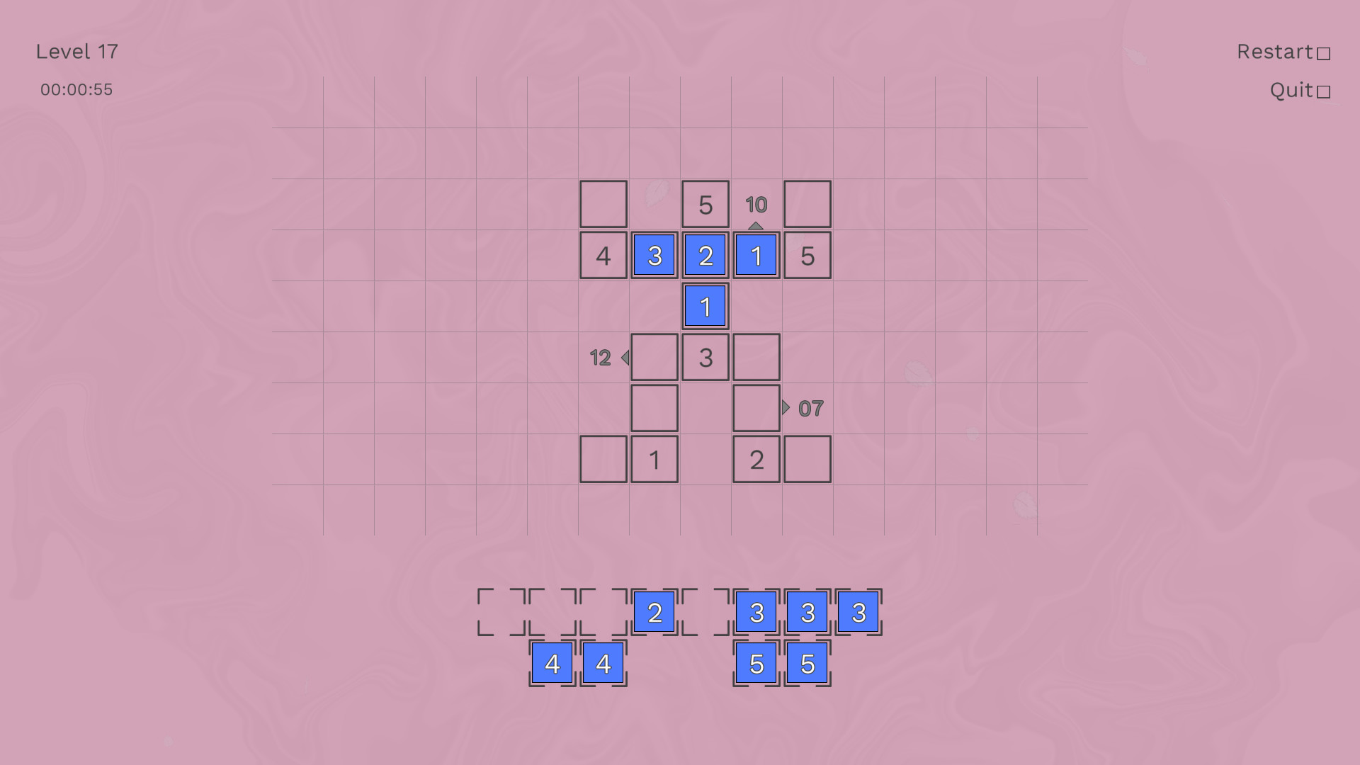 Puzlogic is an unique logic puzzle game inspired by sudoku and kakuro (cross sums). To complete puzzles you must drag the available numbers on the bottom to the free spaces above, following the provided rules. With its minimalistic style and relaxing music, it features 64 puzzles with increasing difficulty and complexity.