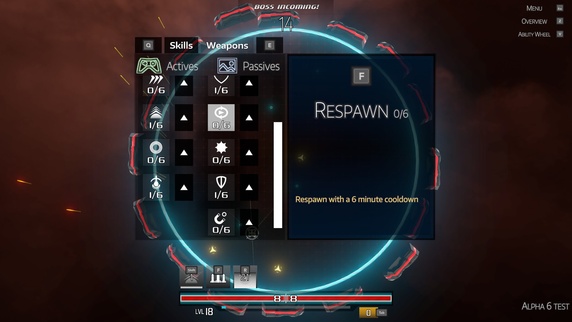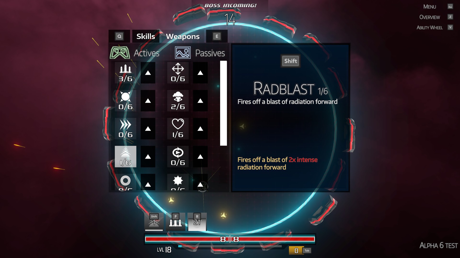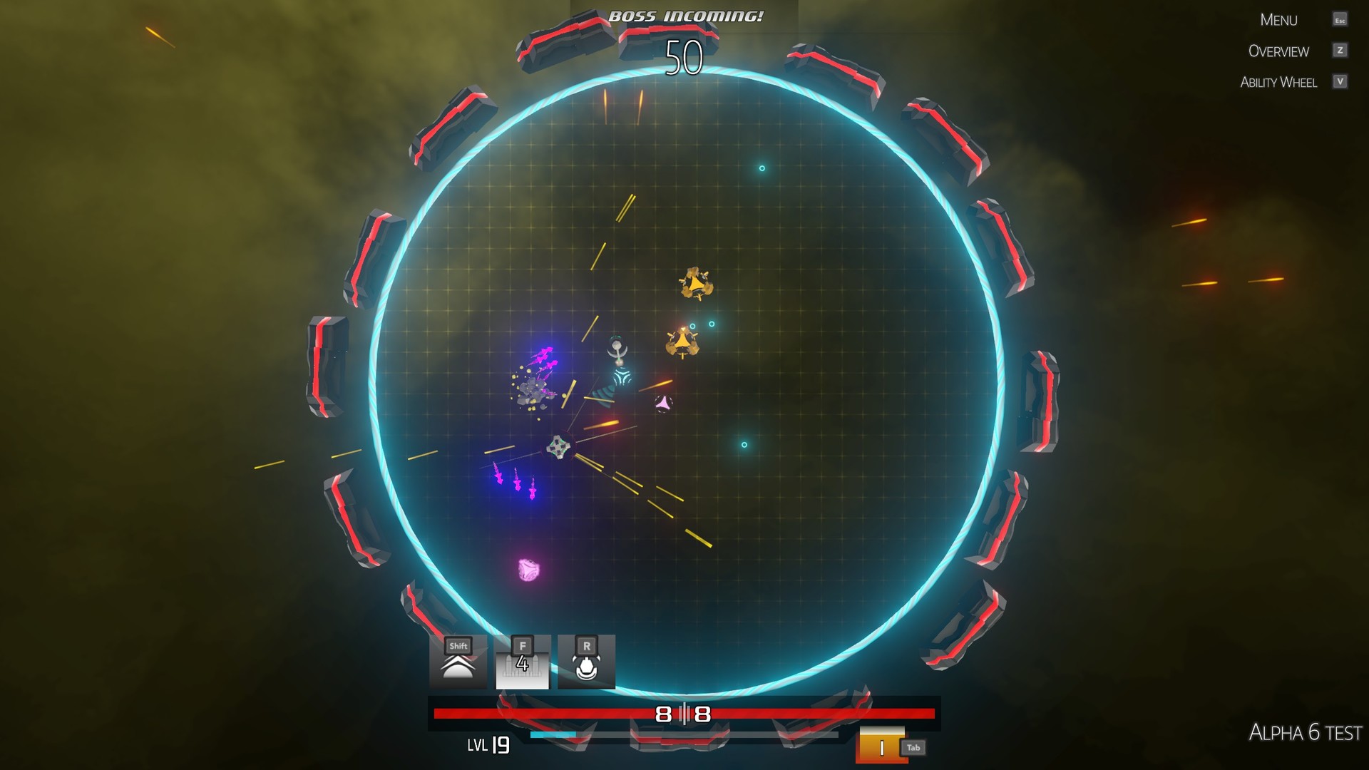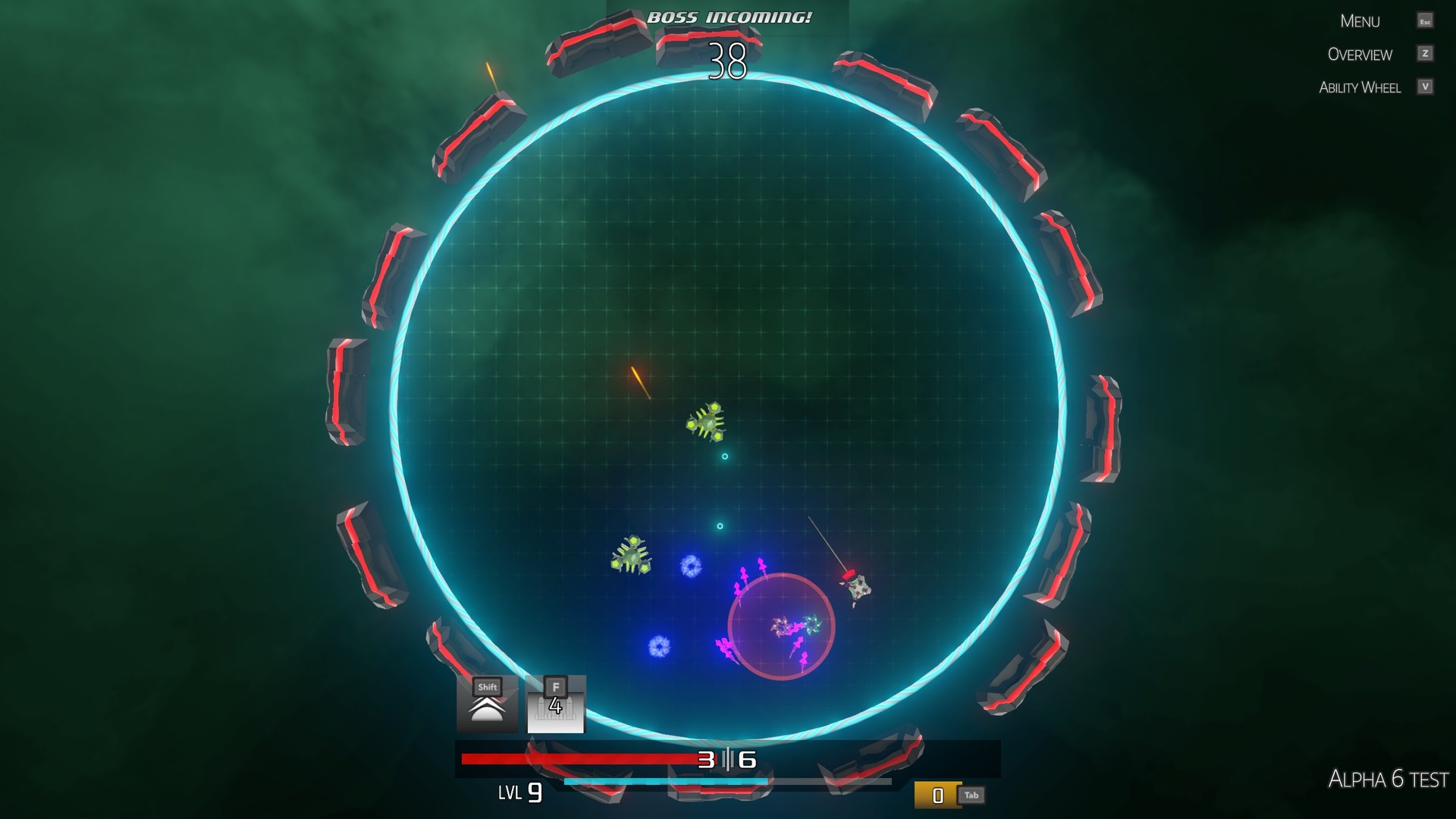 A bright, top-down space arena shooter with, boss fights, upgradable abilities and weapons. Choose from an assortment of weapons and abilities to power up your ship to your liking! But in order to upgrade you've got to defeat increasingly harder enemies to gain points to buy them. Last as long as you can because once you die, it's all over. Although the game is only semi-permadeath... but that's a slight spoiler!