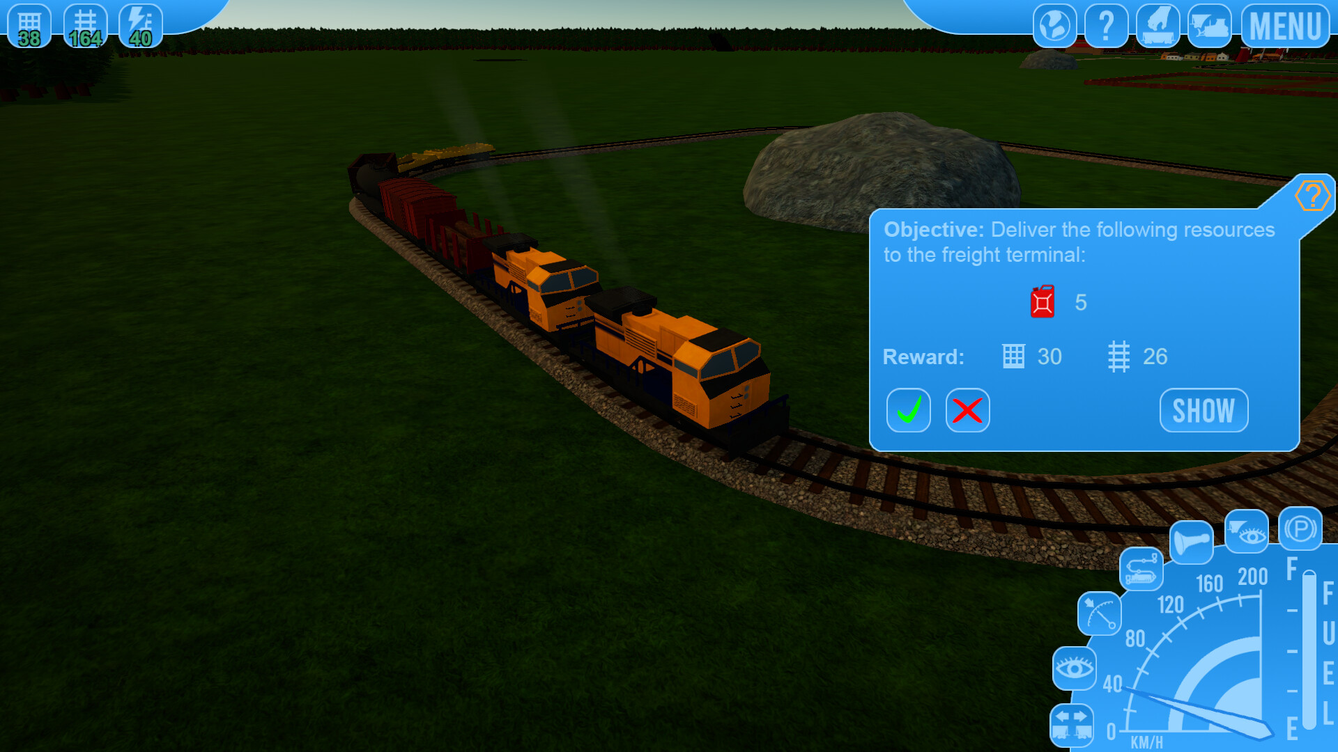 Railroad Engineer is a train simulation game. You build railroads, drive trains, collect resources, deliver goods, and watch cities grow. There several types of raw resources that spawn randomly on the map. You can build resource collection buildings to collect there resources and then transport them to manufacturing facilities to convert them into more advanced goods. There are also several different rail cars in the game, and each one is used to transport specific types of goods and resources. Ores can only be transported in ore cars, liquids in tank cars, and so on.